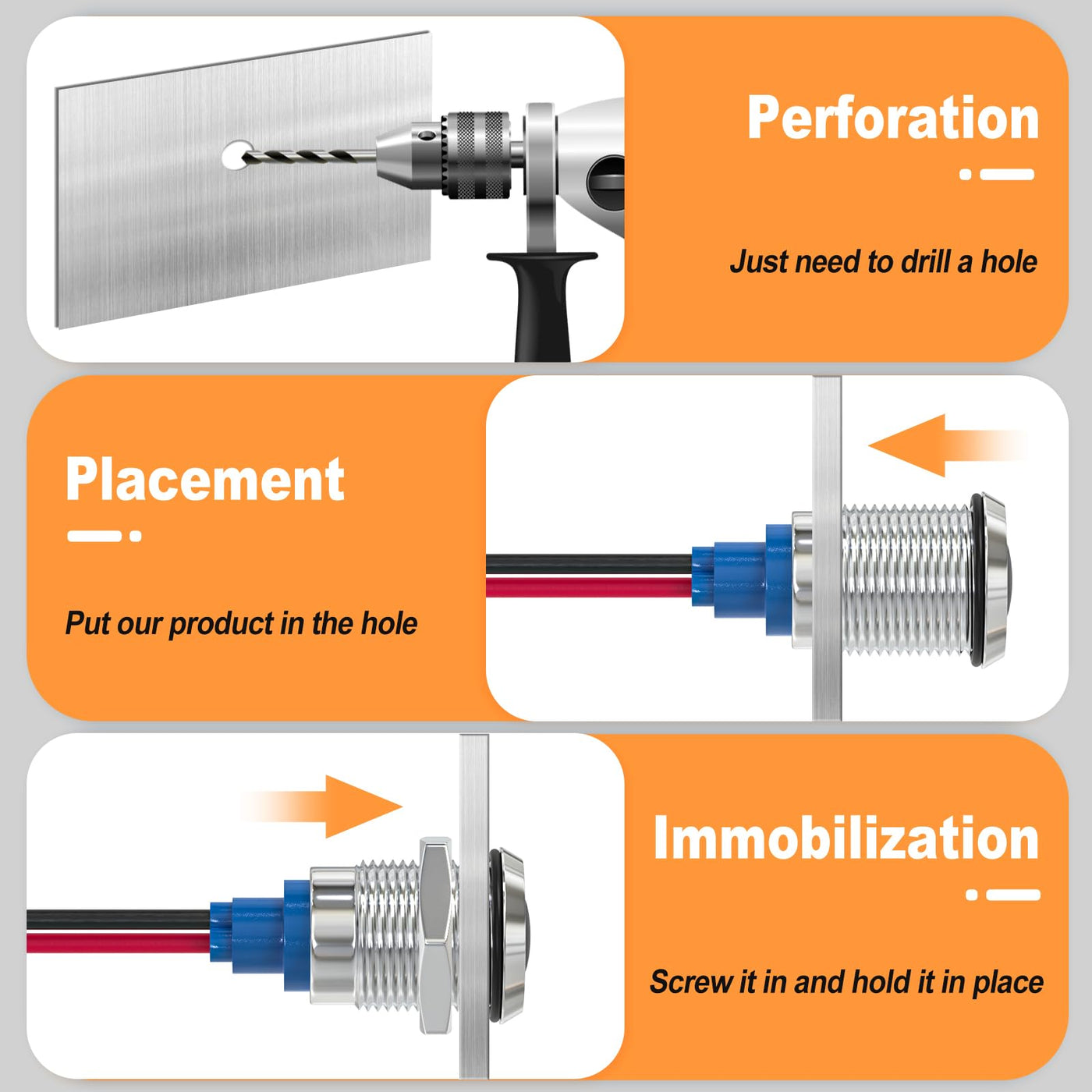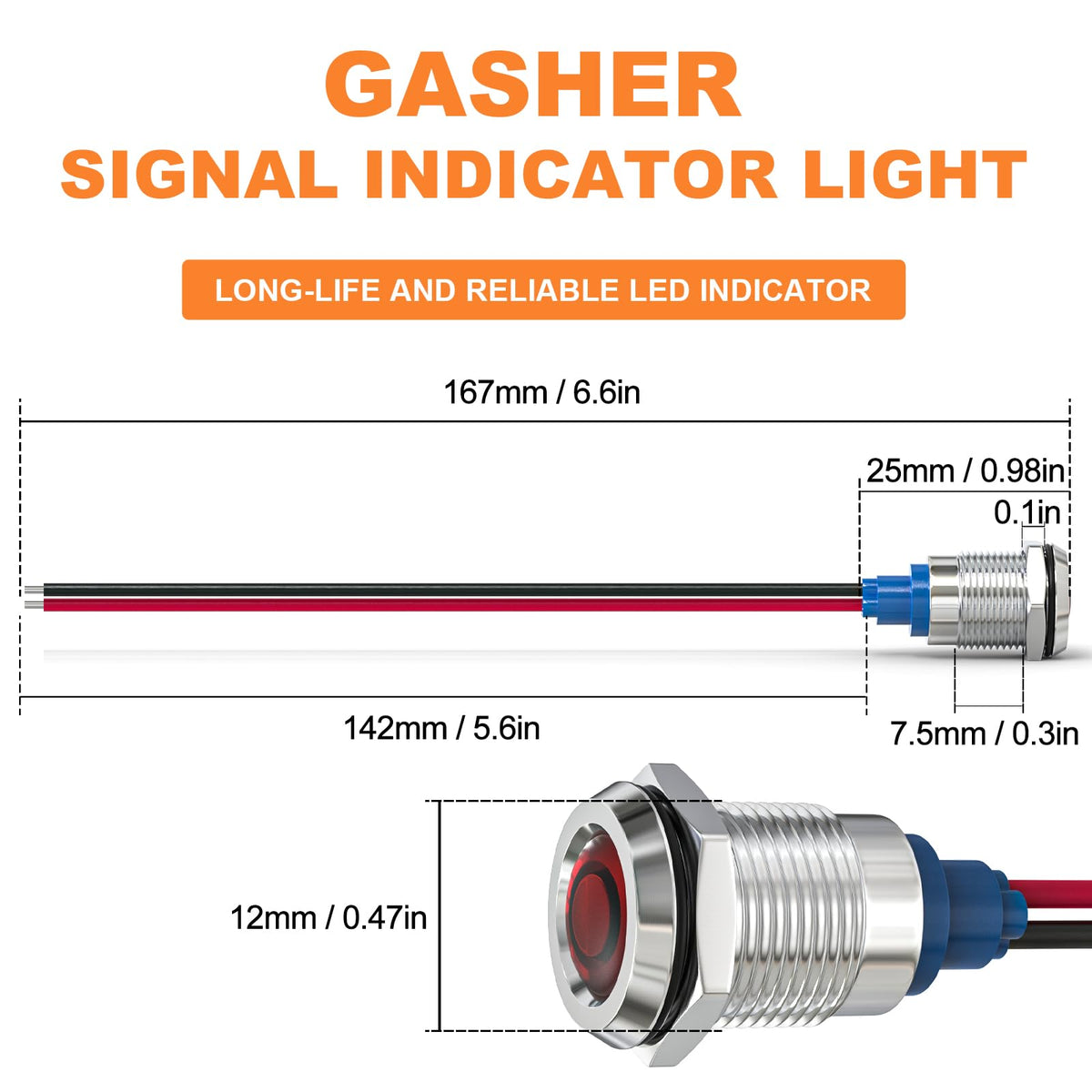 PRODUCT FEATURE 1.Product Features:Waterproof Rating: IP65; Service Life: 10000 Hours; Body Material: Chrome Plated Brass 2.Easy to Use:Energy saving and low maintenance cost. Flush mount for easy connection and strong conductivity. Simply drill a hole and install with nut and washer. 3.Application Range:For use as brake light, speedometer, tachometer, gauge cluster, check engine indicator, high beam indicator, shifter lights and dashboard lights. 4.Indicator Light:These panel mount pilot lights are sure to give you a visual status cue of any indexing signal, anticipating signals, emergency signal and other indexing signals. PRODUCT PARAMETER Bulb Type: LED Waterproof Rating: IP65 Service Life: 10000 Hours Mounting Hole Diameter: 12mm Body Material: Chrome Plated Brass PACKAGE CONTENT 5 X Red Indicator