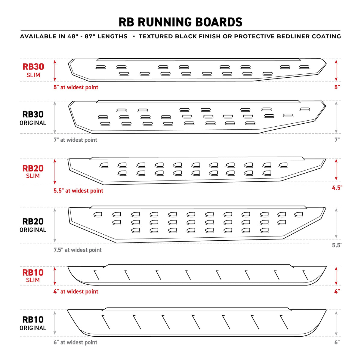 Q: What is the weight capacity of the RB10 Slim Line Running Boards?A: The Go Rhino RB10 Slim Line Running Boards are built sturdy and can support a significant amount of weight, though specific weight capacity details are not provided. They are designed for durability and strength, suitable for everyday use.