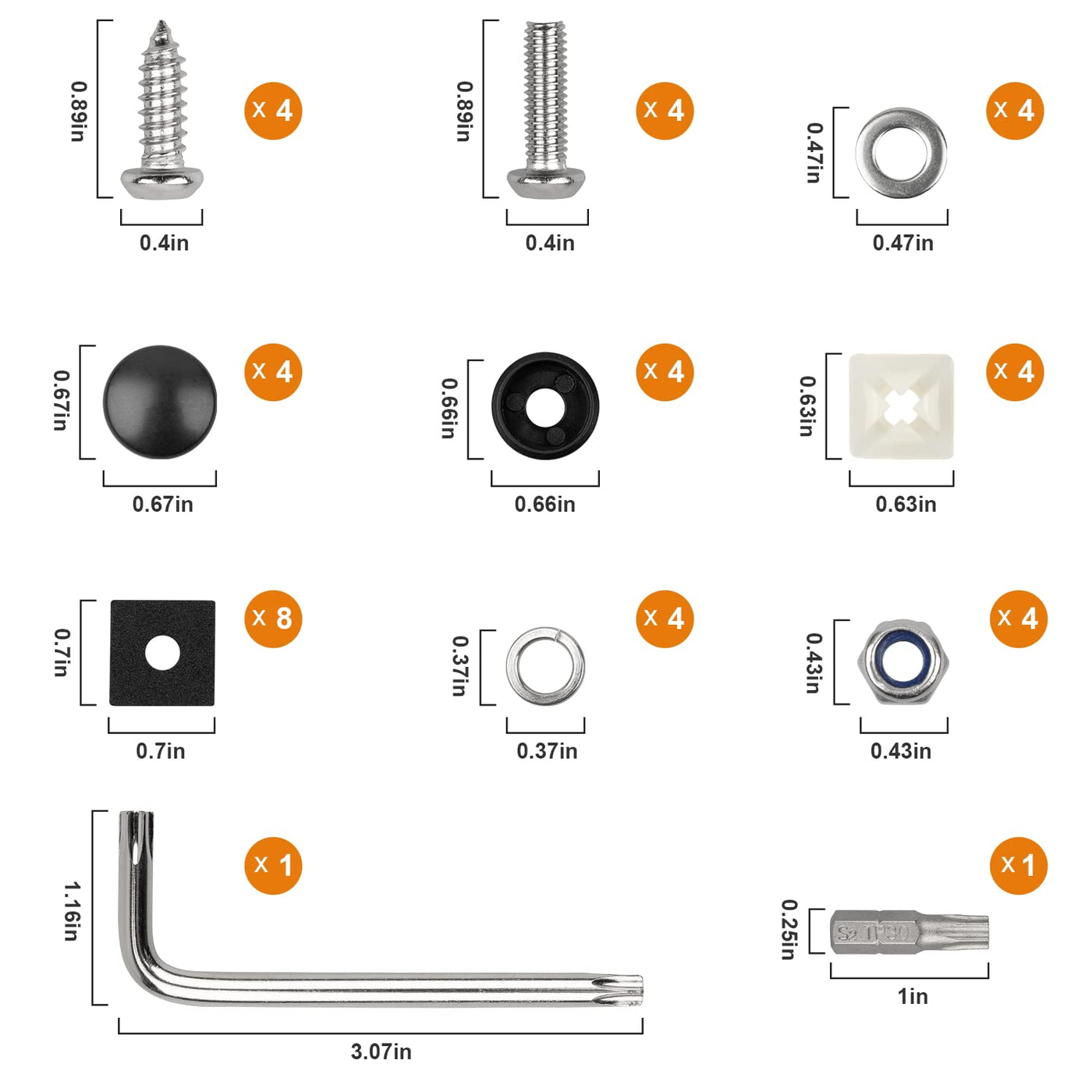 Q: What is included in the License Plate Screws Kits package?A: The package includes 8 stainless steel screws, 8 foam pads, 8 screw washers, 8 screw covers, 4 nylon screw inserts, 4 black nuts, and 1 M6 anti-theft screwdriver, providing a complete solution for mounting your license plates.
