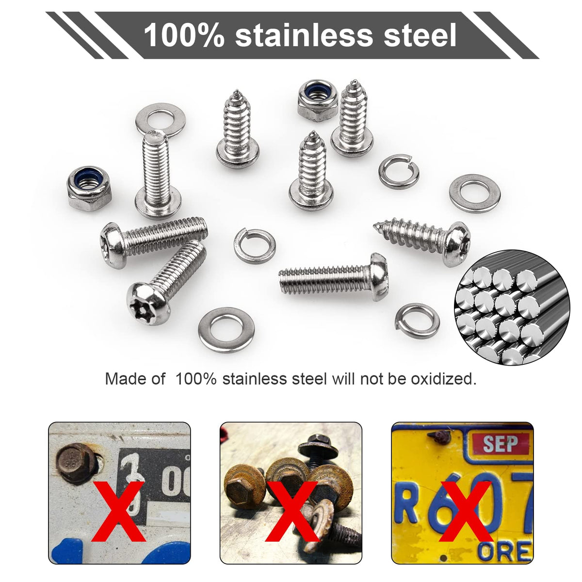 Q: What materials are used in the License Plate Screws Kits?A: The License Plate Screws Kits are made from premium 304 stainless steel, known for its durability, corrosion resistance, and rust resistance, ensuring a long-lasting and reliable solution for mounting your license plates.