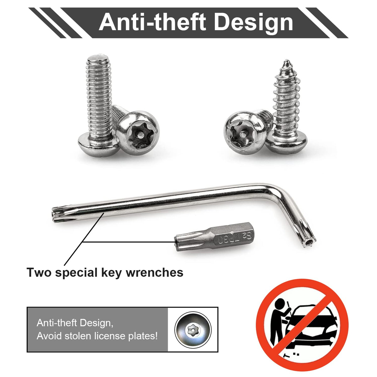 Q: What makes these screws anti-theft?A: These screws feature a tamper-resistant design with a hexagonal button head and an ejector pin, which requires the specific M6 anti-theft screwdriver for removal. This design helps to secure your license plate and deter theft.