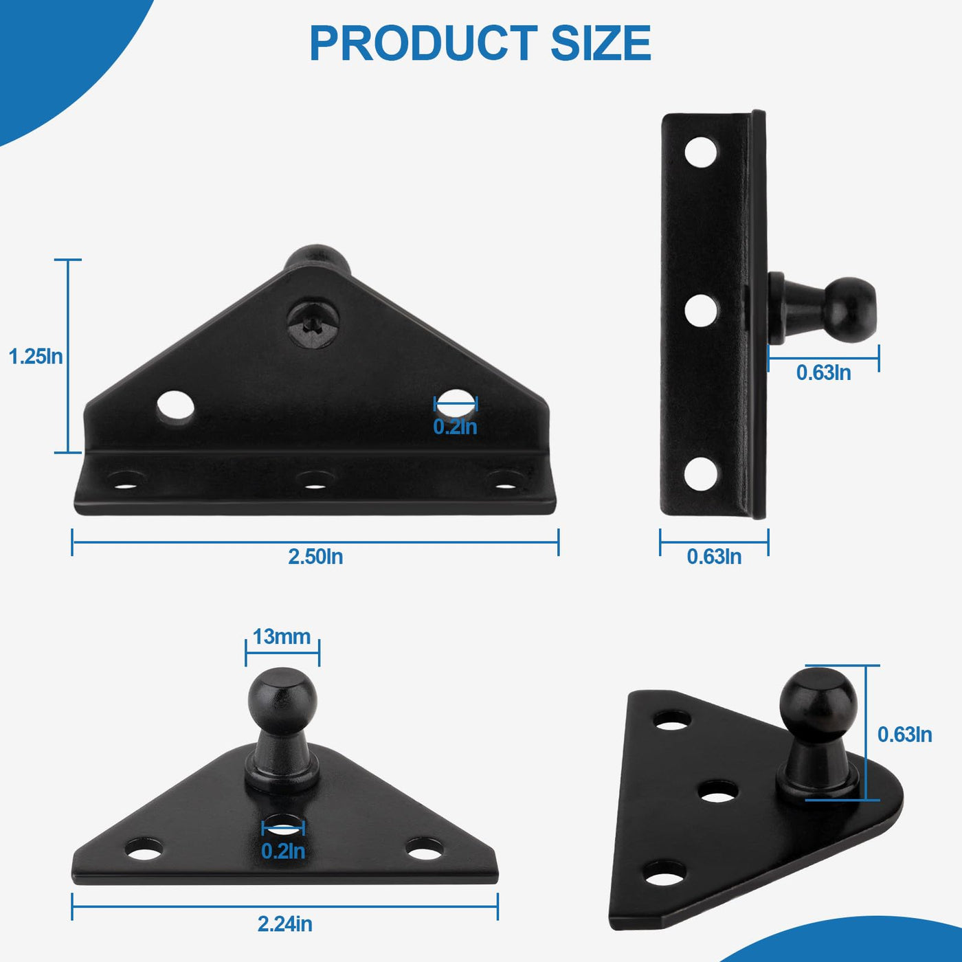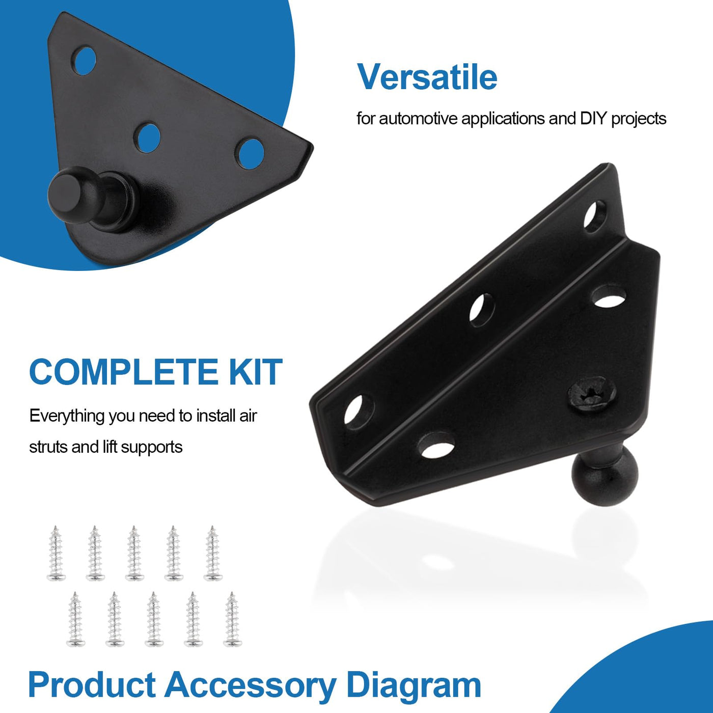 Our brand is dedicated to producing a variety of useful tools, and this ball stud mounting bracket is one of them! This ball stud mounting bracket has been carefully designed to provide a strong connection for smooth operation. The 10mm ball stud bracket is a versatile and dependable accessory for a wide range of applications, including gas struts, lift supports, shocks, springs, and props. Crafted from materials, it offers lasting strength and a sleek black finish that blends seamlessly with existing setups, making it suitable for both commercial and residential use. Its universal design allows for easy installation and compatibility with 10 mm ball studs for secure and safe mounting, ensuring smooth and efficient operation. With its robust construction, the 10mm ball stud bracket provides enhanced stability and support across various projects and systems, such as automotive applications, furniture adjustments, and industrial machinery. Incorporating this versatile and resilient bracket into your gas strut system will upgrade your setup, offering convenience, peace of mind, improved functionality, and an extended product lifespan. Product Information: Color: black Net weight: 0.41 pounds Size: 6.5 x 2 x 1.6 inches Material: steel Package: 4 x mounting brackets 16 x screws