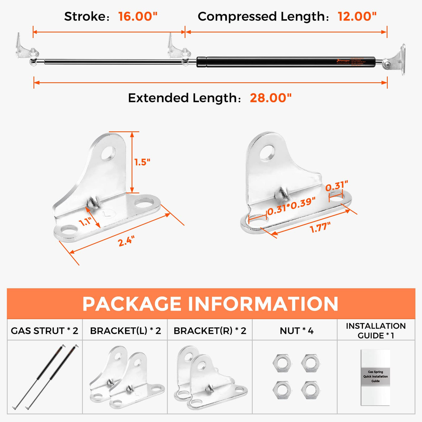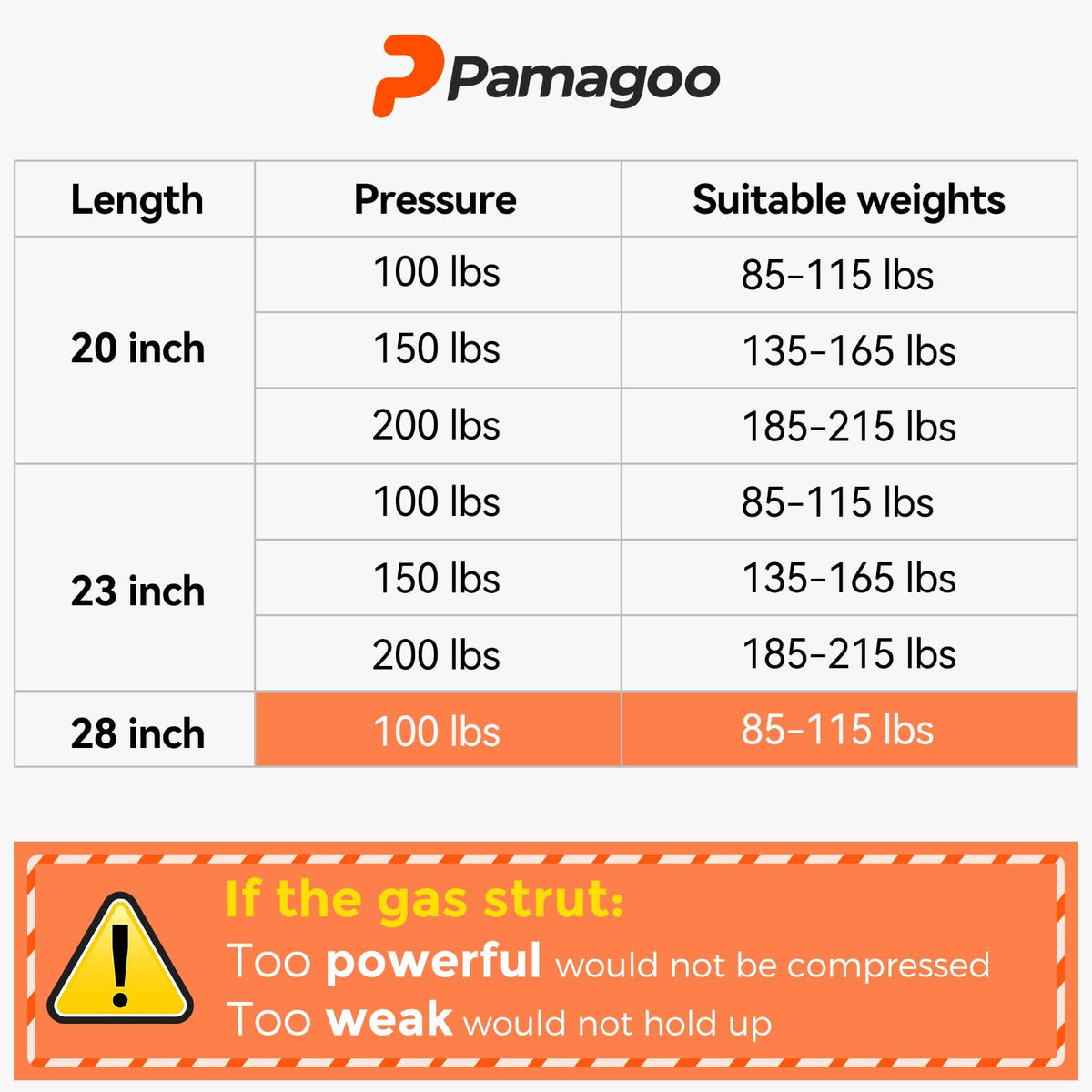 [[Universal Fitment] This 28'' gas struts 100lbs could perfectly work for camper rv queen bed, indoor/outdoor custom-built cabinet trash can, boat truck engine cover tool box, roof window, cellar door, etc | [Easy to Install] We have 28 inch 100 lbs strut lift support installation videos and online service to guide quick installation in minutes. After installation, the Door/Window can be lifted easily | [Choose Correct] Extended length is 28 inch and the compressed length is 16.2 inch when measured from ball center to ball center, pressure is 100lbs/445N which suits for the lid weight: 80-110 pounds | [Build to Quality] Pamagoo gas spring 28 inch have passed 180,000 times fatigue test and 96 hours salt-spray experiment, working temperature from -40? to 60 ? (-40?~140?) | [Pamagoo Care] We provide 24 hours online selection & installation guide and 18 months quality support for every customer, please measure your lid weight as per instruction to ensure buy correctly