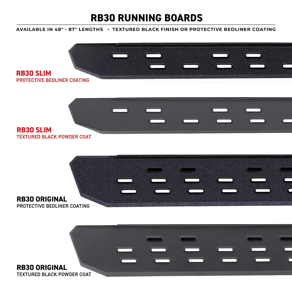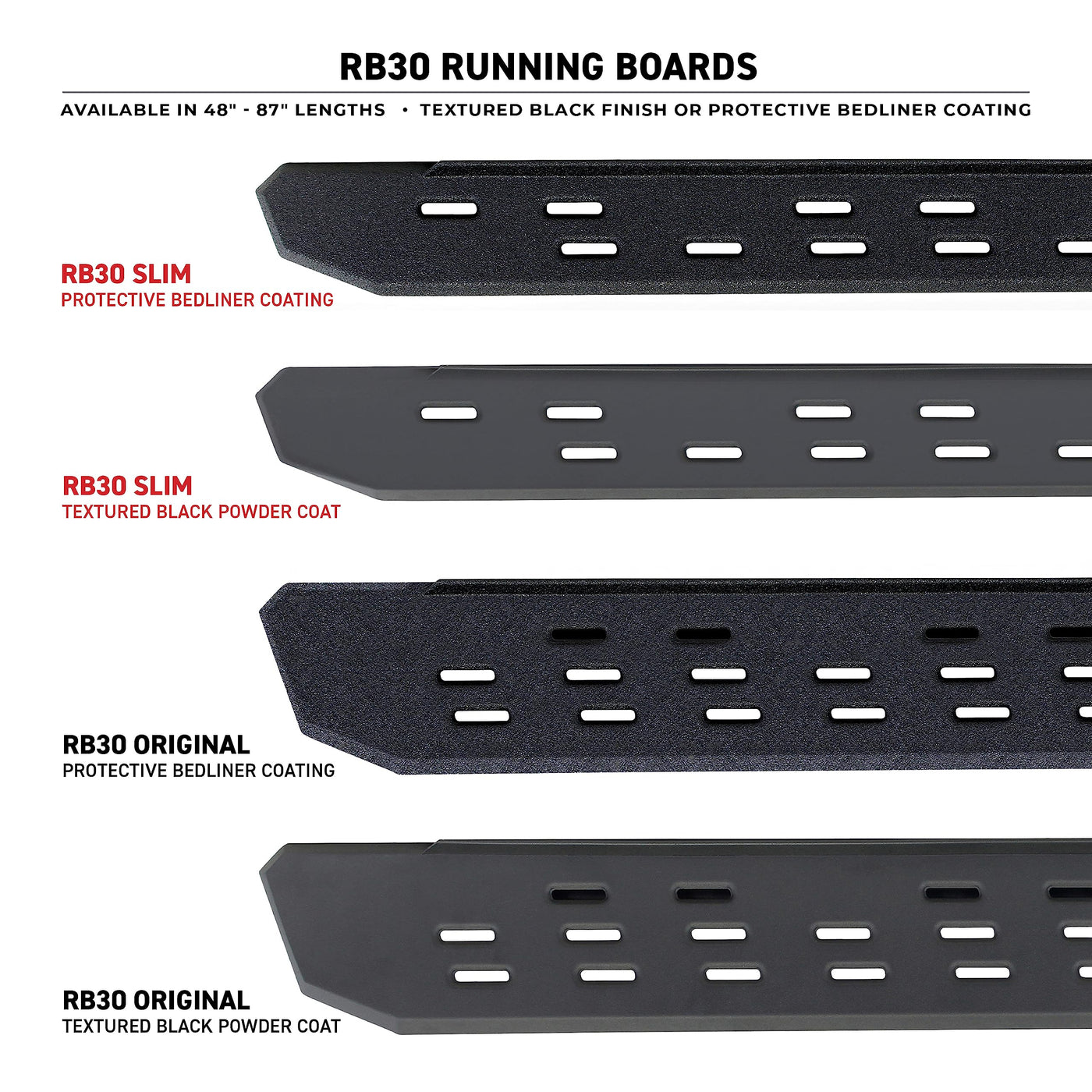 Q: How can I maintain the RB30 Running Boards to ensure longevity?A: To maintain the RB30 Running Boards, regularly clean them with mild soap and water, and inspect for any signs of wear or damage to ensure they remain in optimal condition.
