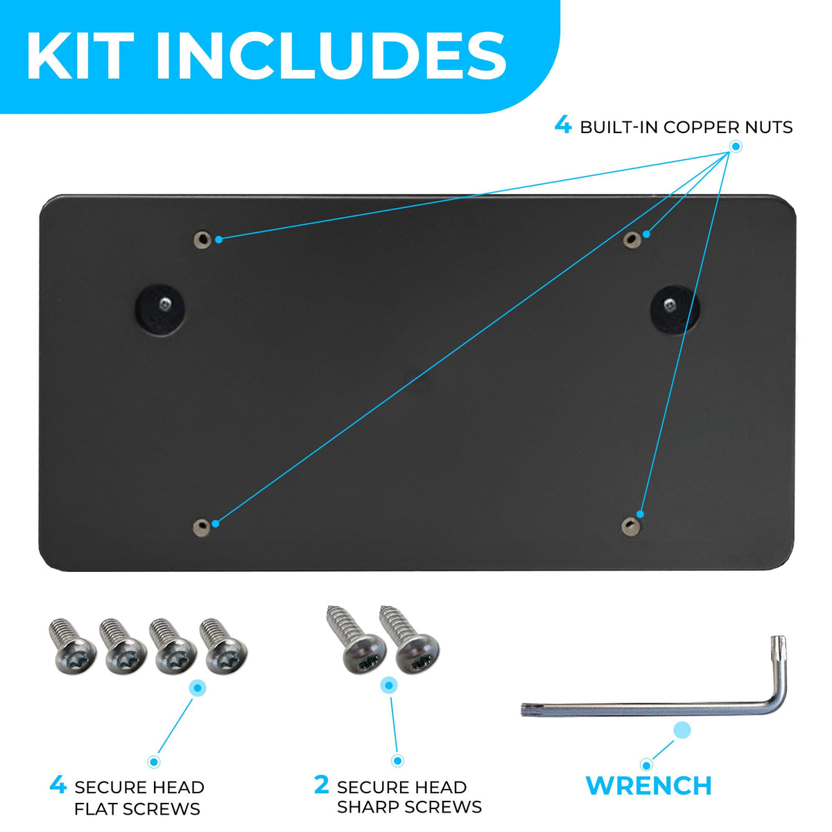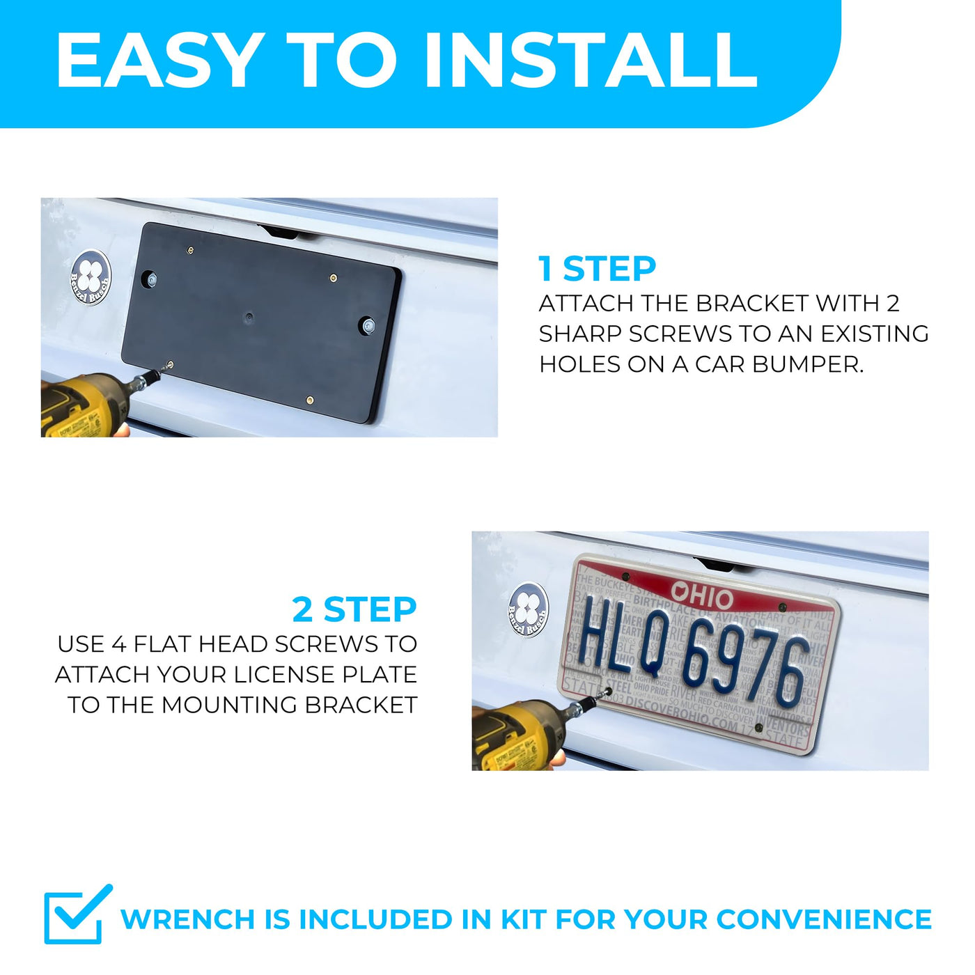 Q: How do I install the license plate bracket on my car?A: To install the license plate bracket, align it with the existing holes on your car bumper. Use the included long screws to attach the bracket securely, and then mount your license plate using the provided small screws.
