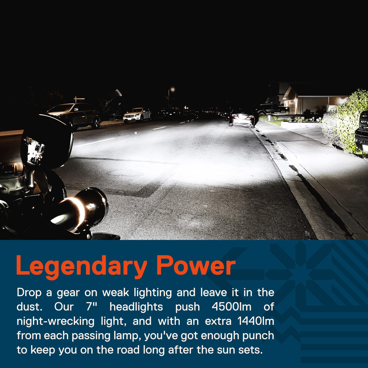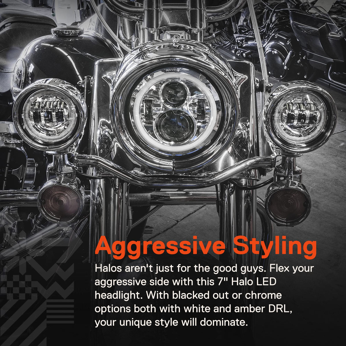 A New LegendBoasting a classic Harley attitude fused with a powerful halo design, this light kit is as real as it gets. And whether youre going for a sleek blacked-out look, or you lean towards chrome, we've got you covered with two different housing options.Bigger, Faster, BetterCombining the heavyweight muscle of a 9 LED 7 headlamp, the technical prowess of two 6 LED 4.5 passing lamps, and the flawless control of an integrated anti-flicker CAN bus chip, these lights have the long-armed reach to come out on top.True to Your BikeHarley is in your blood, lighting is in ours. Our lights come with an integrated CAN bus chip to eliminate flickering that can be caused by installing an inferior LED headlight, two different adapters to simplify the install, and a black or chrome vibration-dampening mounting bracket. What's Included?(1) 7'' Round Harley Davidson Motorcycle Headlight Mounting Bracket - CHROME(1) Headlight Mounting Bracket(1) Instruction Manual(2) 4.5'' Round 30W 6,500K Fog Light w/ Halo - Chrome Housing(1) 4.5'' Fog Light(1) 2-Pin Connector(1) Set of Extension Wires(1) 7'' Round HALO Harley Davidson Motorcycle Headlight Kit - CHROME(1) Harley HALO Headlight Kit(1) H4-H11 Converter(1) H4-4 Pin Converter(1) Instruction Manual