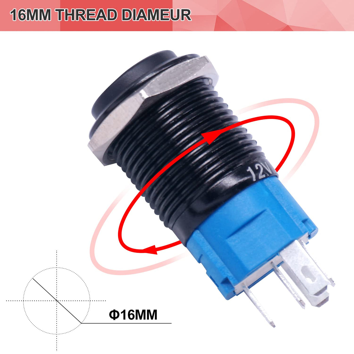 Twidec/16Mm Raised Speaker Horn Momentary Push Button Switch 5/8'' Mounting Hole 12V Red Led Light Black Stainless Steel Shell 1