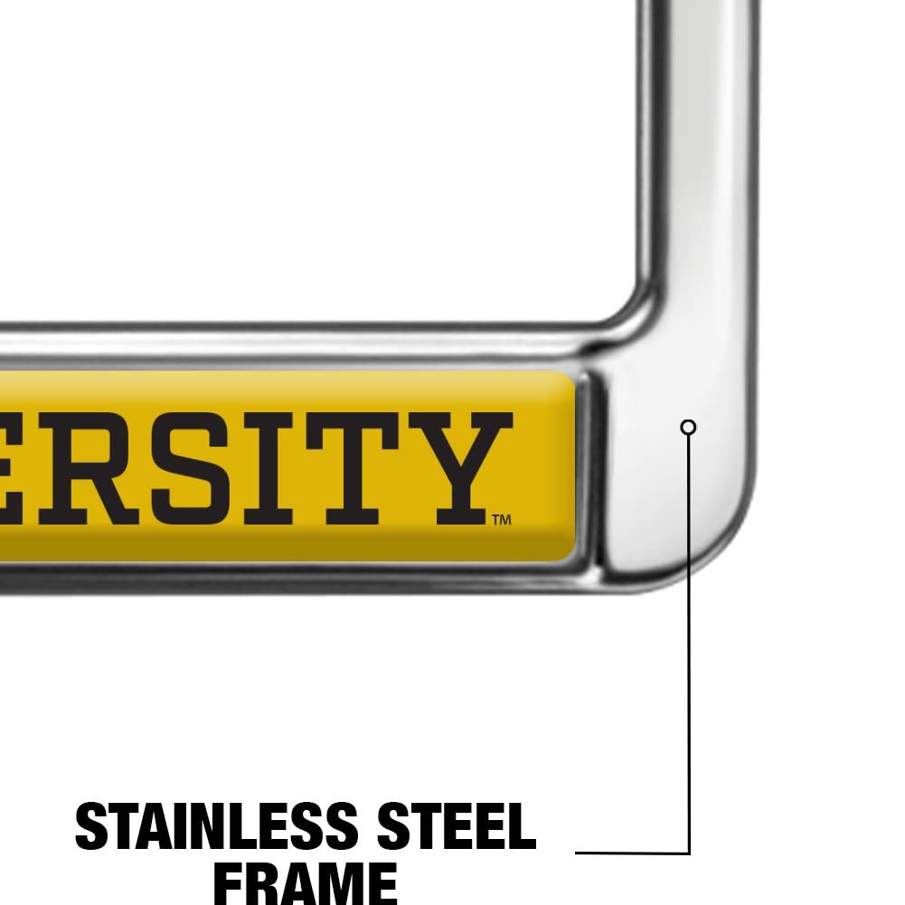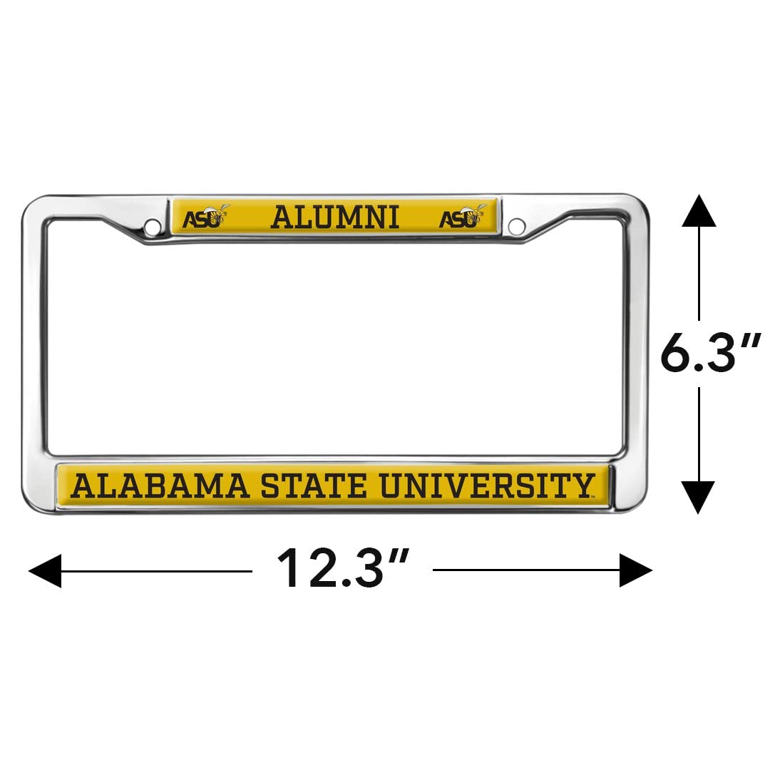 About The Product: Your license plate is for identifying your vehicle as unique, so why shouldn 't your license plate frame do the same? Show off your one-of-a-kind sense of style with one of our license plate frames! These awesome frames are made of a durable metal, and have the design shown printed directly onto the front. The ink is UV and water-resistant, so no need to worry about fading or smearing. This frame features two standard mounting holes on the top for a stable hold, as well as cut-out corners to avoid covering up those all-important state registration stickers. The frame is 12.3 '' x 6.3 '' in size, and will fit all North American license plates. About The Design: Founded in 1867, Alabama State University is one of the nation 's oldest HBCUs. The campus is located in Montgomery, Alabama, just a few blocks from the state Capitol and the city 's growing commercial district. Show your support with this official Alabama State University product!