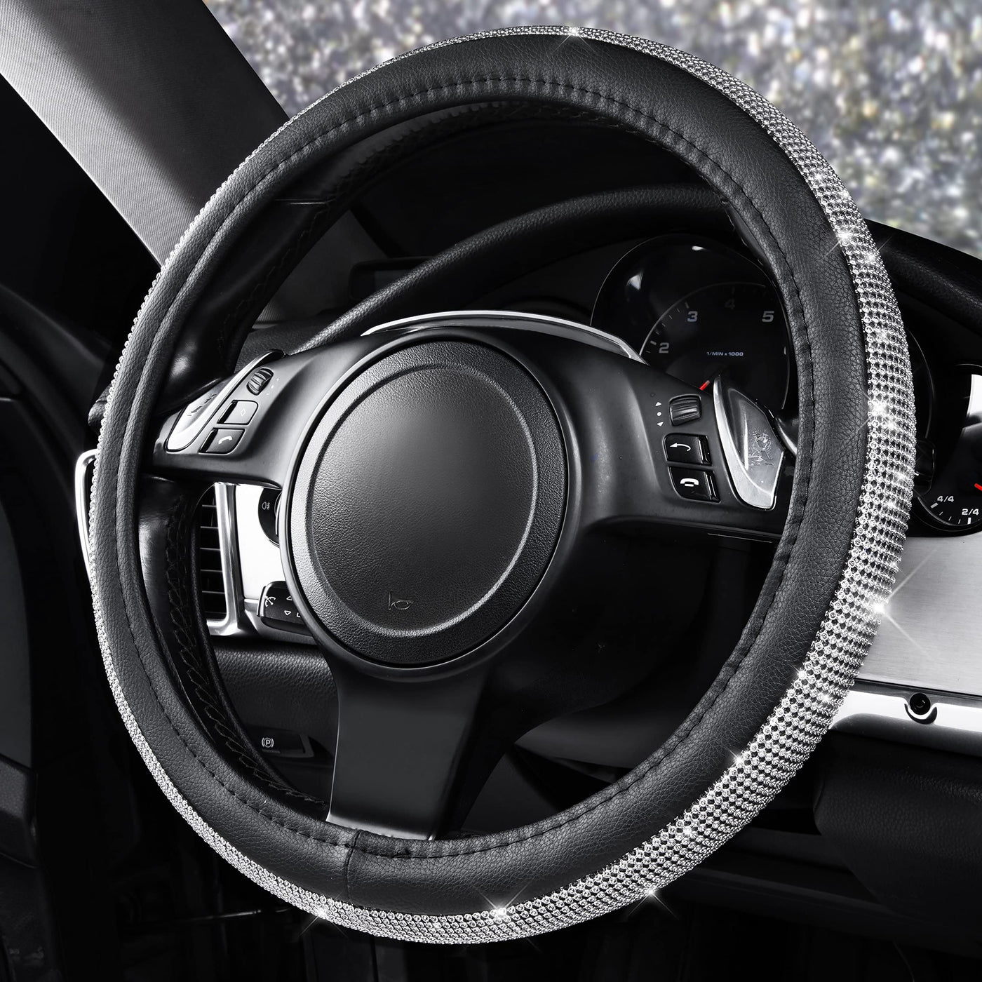 SILVER DIAMOND LEATHER: Premium Quality Material: PU Leather and Top diamond craftwork. The SILVER Crystal Steering Wheel Cover made of durable microfiber leather and SILVER DIAMOND, consisted hundreds of shiny rhinestones. Super Sparkly, Better Spotlight. Each diamond is fixed by the SILVER metal frame, Non-Dropping Diamond, Comfortable Feelings, does not scratch hands, and has good anti-slip effect. | STANDARD SIZE FITS MOST VEHICLES: Package Contains: 1*bling steering wheel cover. The bling diamond steering wheel cover measures 14''1/2-15''. Suitable for 95% of cars. Flexibly, easy to install. The distribution of anti-slip rubber points inside effectively ensures safe driving. washably. Beautiful and sturdy packaging to safely ship the bling steering wheel cover to you. | LUXURY AND FASHION: Great Touch Feeling. Sparkle rhinestone massage your palm and relieve driving fatigue. This cute steering wheel cover not only bringing you an excellent visual feel, but also relieving you from driving fatigue, more comfortable and soft touch. Diamond steering covers sparkle in the sun, add a luxurious brilliance to your car, perfect for a girlfriend birthday gift. | EASY INSTALLATION: This PU leather steering wheel cover requires hassle-free installation (You can refer to the installation instructions on our product page). Simply slip it right on to your steering wheel and your good to go. Just place the cover on top of the steering wheel. Press and hold the upper part of the cover and gradually lower it with both hands on either side to tighten. | EXCELLENT SERVICE: Our Brand is CAR PASS and we offer high quality CAR STEERING WHEEL COVER AND OTHER CAR ACCESSORIES. We put product quality and your trust first. We do our best to provide you with quality service.