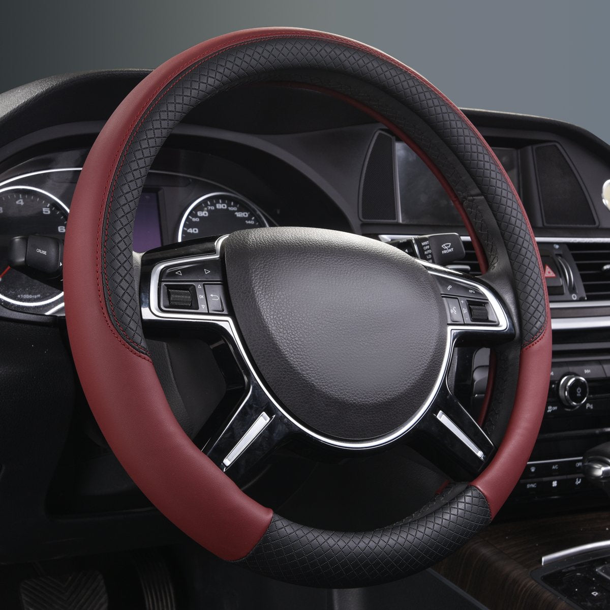 Car Pass Rhombus Leather Universal Steering Wheel Cover, Fit For Suvs,Trucks,Cars,Sedans,Vans (Black&Burgundy)