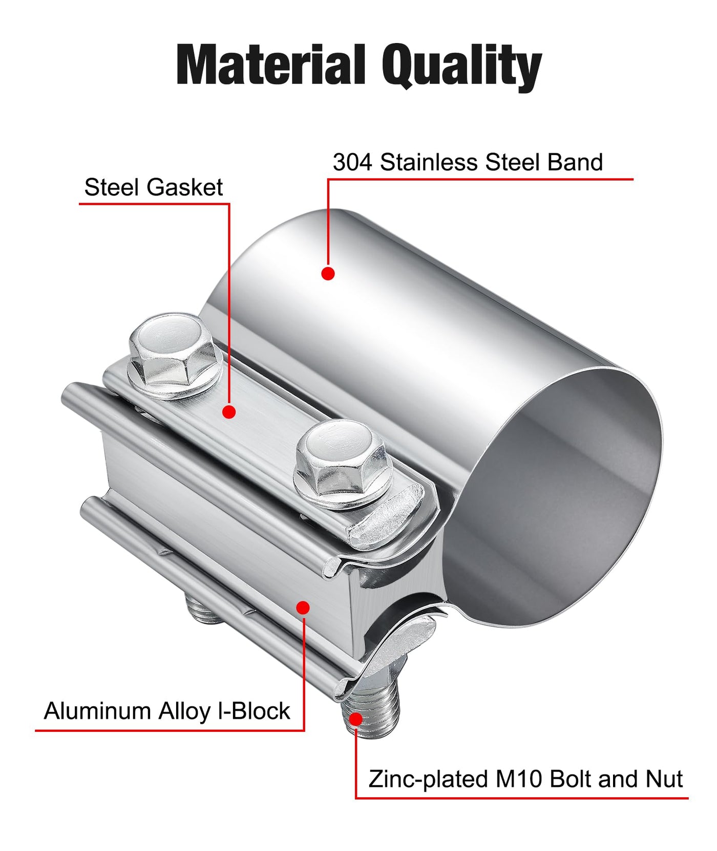 Q: What materials are used in the construction of this exhaust clamp?A: The clamp is made from high-quality 304 stainless steel, and includes a zinc-plated M10 bolt and nut, a steel gasket, and an aluminum alloy I-block for enhanced durability and performance.