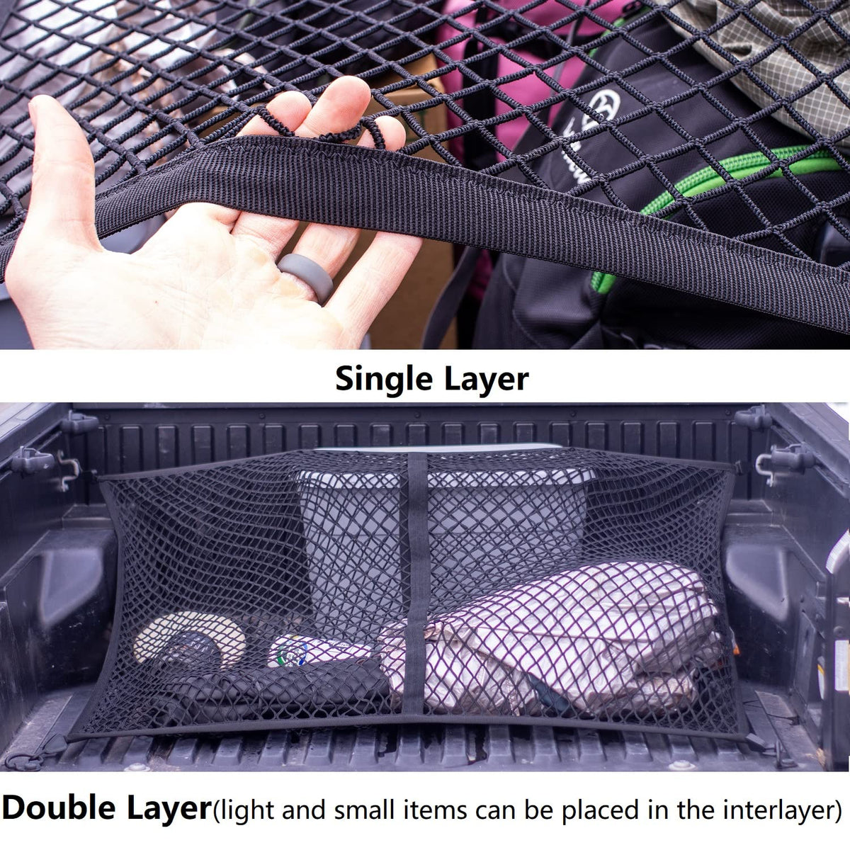 The Highly Elastic Cargo Net Is Designed For Holding Items In Place Without Lashing While Transporting Compact Loads. By Using A Truck Bed Cargo Mesh Organizer, Tiresome Bundling Can Be Avoided. It Will Let You Embark On The Journey Swiftly And Effortlessly. 8-Piece Durable Metal Carabiners Are Utilized In This Simple Truck Cargo Net To Securely Fastenobjects, Strong Elasticity Keeps Objects In Place At All Times, Without Requiring You To Struggle To Tighten Each String. There Is A Double-Layer Net, Which Is Optional, And The Interlayer Can Be Used To Store Tiny And Light Items. Our Highly Elastic Cargo Net For Trucks Is Ideal For Traveling And Is A Must-Have Addition To Birthday, Holiday, Or Christmas Gifts For Dad, Spouse, And Friends Traveling Outdoors.