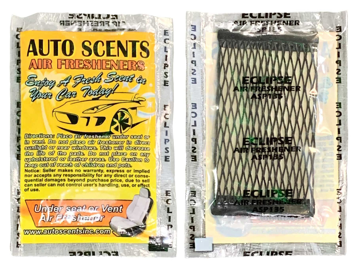 Auto Scents - Individually Wrapped Car Air Freshener Pads (15 Per Pack) - Over time cars begin to pick up a musty odor. Get rid of the bad smell in your car and replace it with the freshness of these car air freshener scents. With many scents to choose from, these car air fresheners are sure to leave your vehicle smelling new and clean. They aren't limited to cars, these are great RV air fresheners and boat air fresheners as well. These car dealer air fresheners are used by the pros from car dealerships to car washes. When their reputation is on the line, they choose the best. Get your Auto Scents Air Freshener pack today! Heavily scented for long-lasting use to remove stale or musty odors. Pad size is 1.5 x 3 inches. Packaged 15 individually wrapped pads of one scent per box. Scent Description: Eclipse - A crisp and clean men's cologne style fragrance. Note: Periods of extreme heat will reduce the lifespan of all air freshener pads. Do not place air freshener in direct sunlight or near windows as it will shorten the life of the pad.
