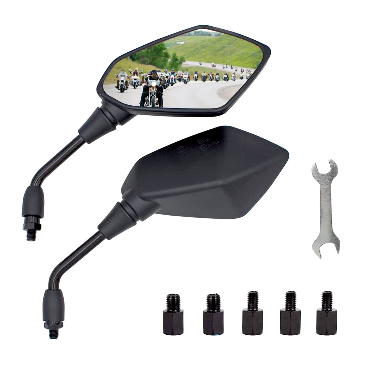 Q: What types of motorcycles are compatible with the MAMIKO Universal Rear View Mirrors?A: The MAMIKO Universal Rear View Mirrors are suitable for a wide range of motorcycles, including Street Bikes, ATVs, Dirt Bikes, E-Bikes, BMX Bicycles, and Scooters. They are compatible with brands such as Kawasaki, Suzuki, Honda, Victory, and Cruiser Chopper.