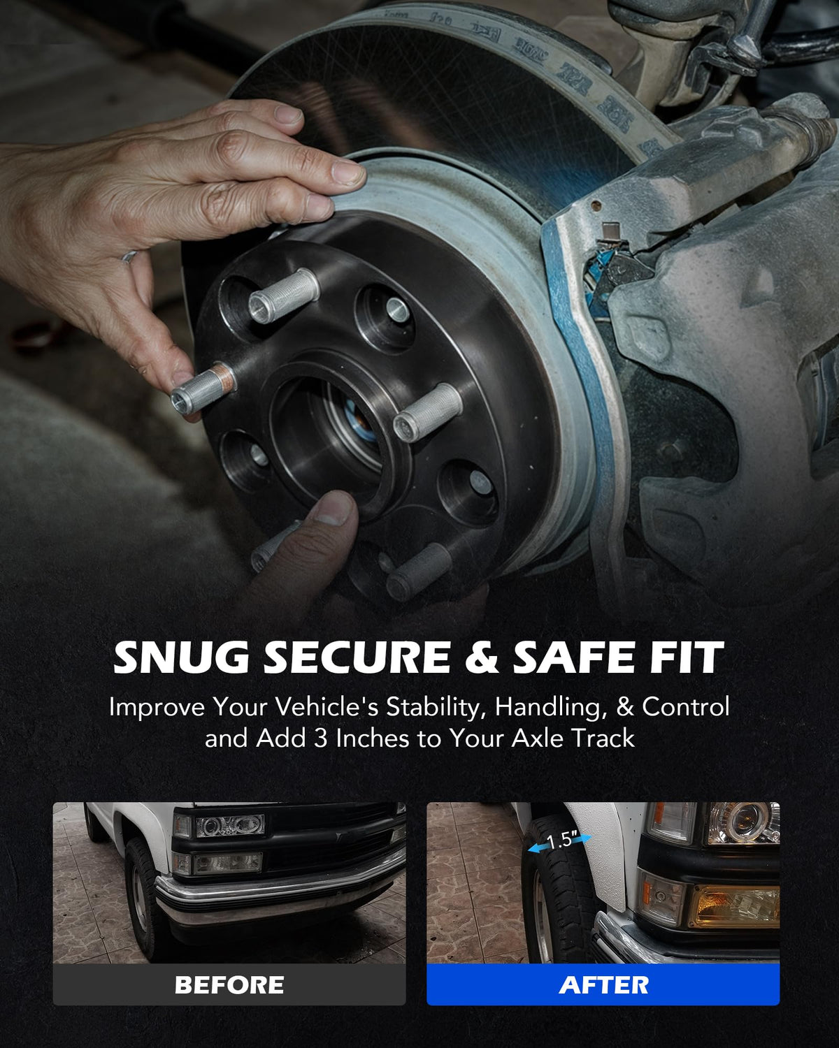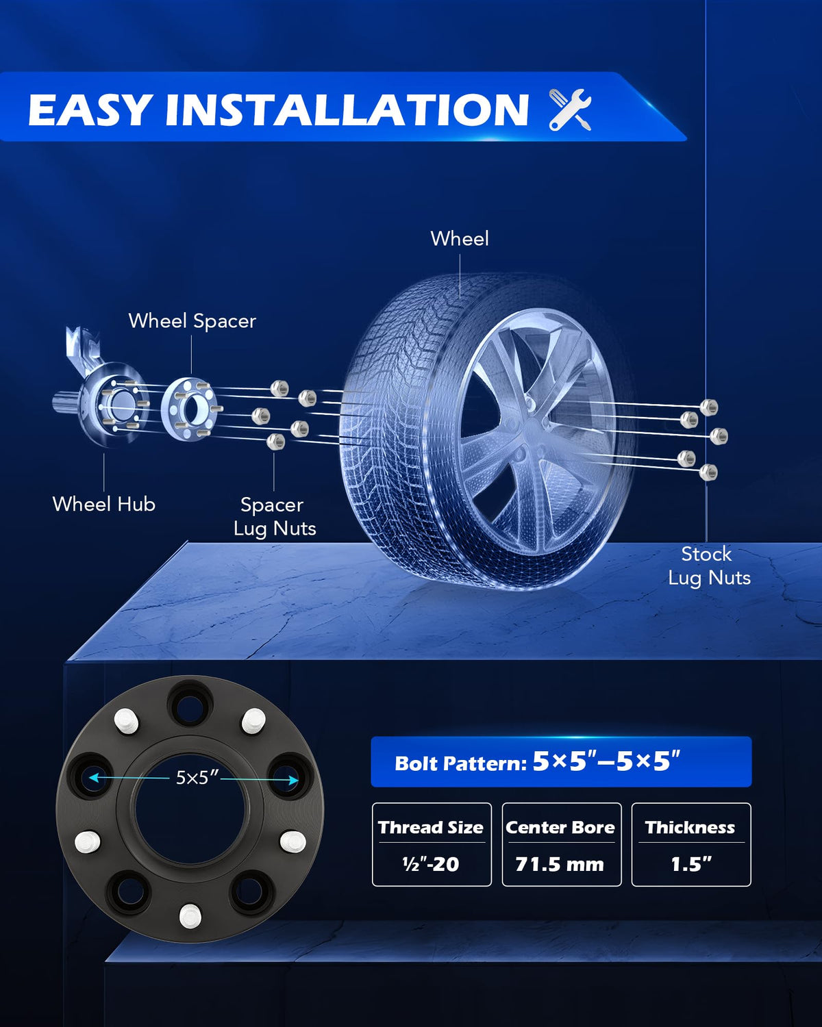5x5in (5x127mm) to 5x5in (5x127mm) PCD (Vehicle/ Wheel Bolt Pattern), SAE 1/2in-20 Thread Pitch (34 plusminus 0.3 mm Thread Length), 2.81in (71.5mm) Hub Bore, 4pcs 1.5in ORION MOTOR TECH WHEEL SPACERS will widen your car's wheel base, improving grip, handling, and precision. Developed in a special aluminum alloy through an innovative forging technology, afterwards they are wrought with CNC machine (computer numerical control) to obtain the perfect coplanar surface. They are heat treated to increase the mechanical resistance and next they are anodized to get the oxidation protection. The wheel spacers increased the track improving the driving precision. Back up by 3-year worry free service, contact our friendly and helpful customer service representatives if you have any questions, we will be glad to address any questions or concerns. PACKAGE INCLUDES: ? 4 x hub-centric wheel spacers (1.5in per unit) ? 1 x high strength thread-locking (black) ? 1 x user manual.