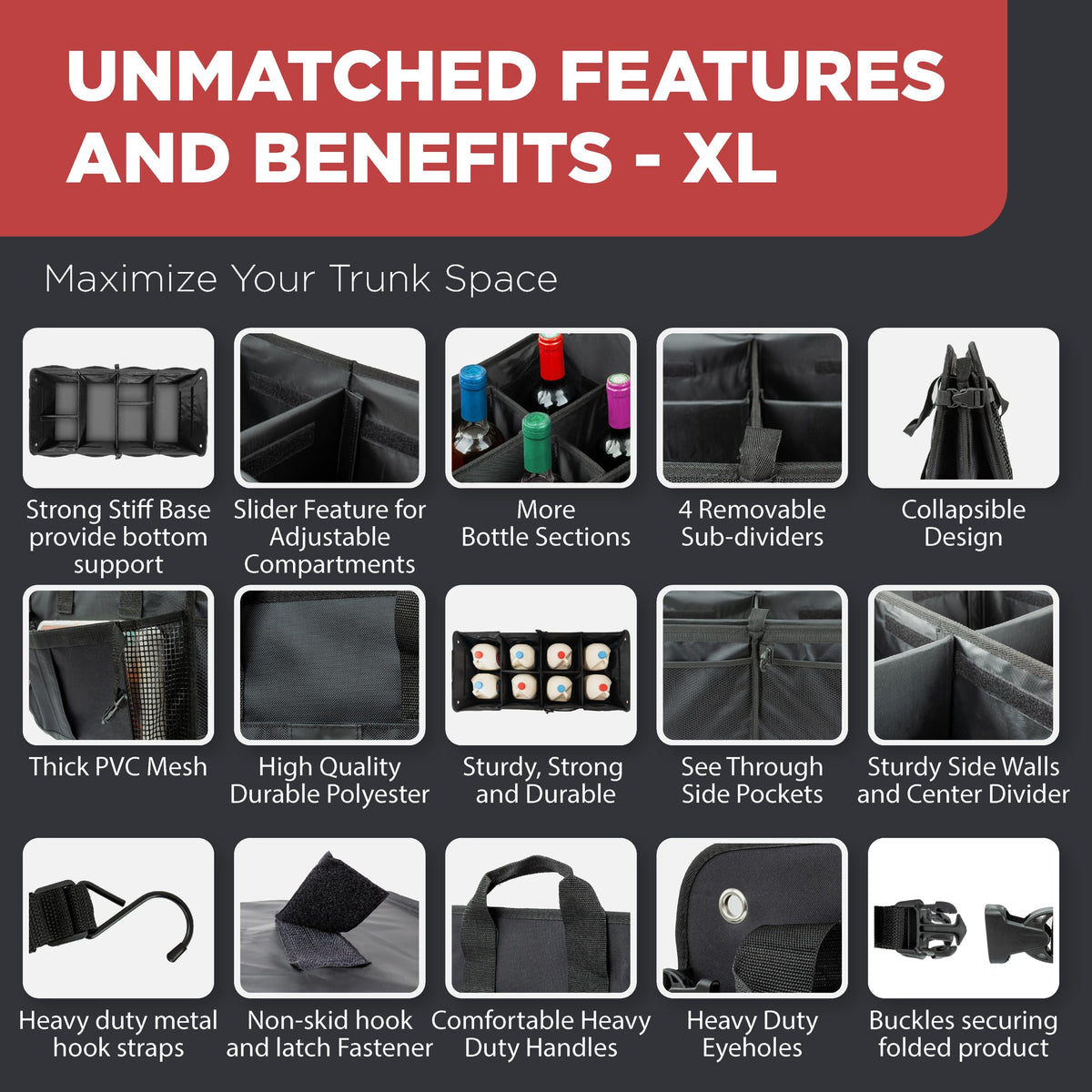All-In One Extra Large Grey Trunk Organizer For Suv, Car And Large Vehicles Allowing For As Many As 6 Compartments, 4 Removable Sub-Dividers For Customization ? 11 Pockets In Total To Store Small, Medium, Big Items - 2 Large Expandable Quality Pockets, 8 Fabric Pockets And 1 Mesh Pocket Give You Plenty Of Extra Storage Space ? When Open, Our Car Organizer Is 36.22'' (90 Cm) * 17.13'' (43.5 Cm) * 12.5 Inches (32 Cm)It Is The Ideal Solution For All Your Supplies - One Of The Largest, Strongest And Durable Auto Trunk Organizers On The Market With The Customization Of Being Able To Fold In Half For Various Job Sizes ? Sturdy Side Walls And Center Divider To Hold Your Organizer Open And Give Strength Even When Empty ? Adjustable Subdivider And Slider Permits Different Size Compartments ? Exclusive Non-Skid Feature To Prevent Your Cargo From Moving During Travels ? Thick Pvc Mesh That Can Endure And Withstand The Wear And Tear Of Vehicle Use ? Strong Stiff Base To Provide Bottom Support ? When Folded In Half, 20.9'' By 17.12'' By 12.5, Our Suv & Car Storage Is The Ideal Storage Container Or Seat Organizer For Men And Women To Be Used In Shopping Cart, Car Seat Or Picnic Basket (Car Trunk Organizer, Backseat Or Front Seat Organizer) ? Collapsible And Folds Flat To 1.5 And Can Be Stored In Drawer ? High Quality Durable Polyester That Will Last You A Long Time ? Heavy Duty Eye Hole That You Use To Clip To The Back Of Your Truck (Truck Organizer) ? Strong, Non-Slip Comfortable, Heavy Duty Strap Handles With Grips To Allow For Easy Transport ? Easy To Use And Carry: This Trunk Organizer Is A Space Saver And Allows For Flexible Space Design When Folded ? Fits All Vehicles (Truck, Jeep, Suv, Van, Car) This Premium Suv And Car Trunk Organizer Normally Sells For $99 Plus. It Is Absolutely Risk-Free With A 100% Satisfaction Guarantee. With Limited Stock, It Will Not Last. Get Yours Now While In Stock In Automotive Car Accessories