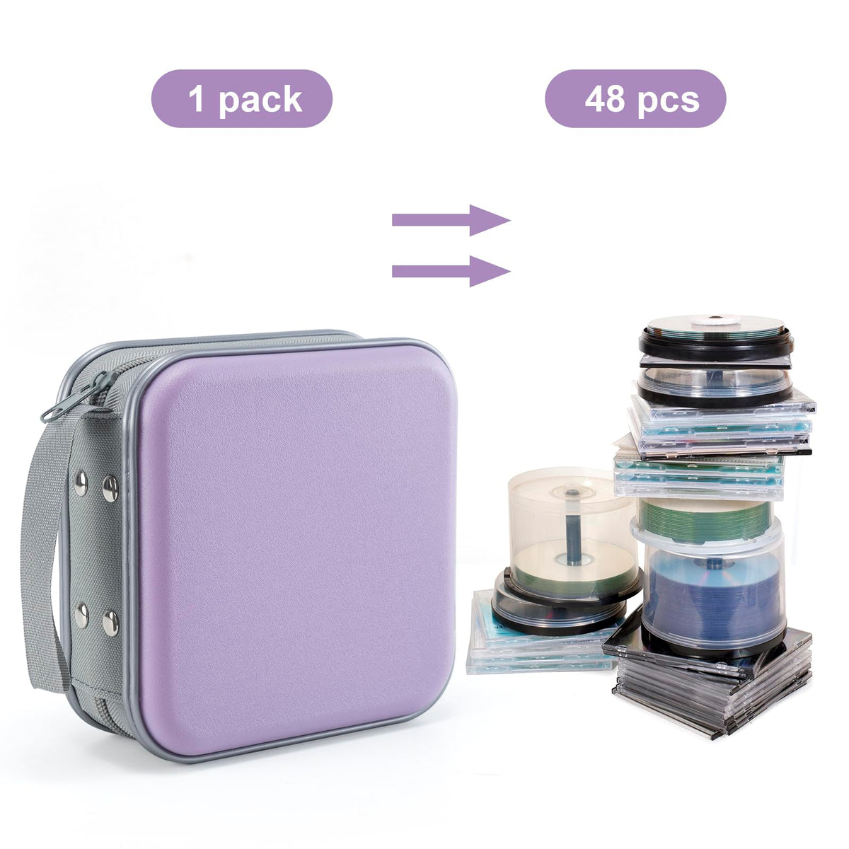 PORTABLE CD CASE:The product size of the CD case is 15.24 * 15.24 * 7 cm/6 * 6 * 2.75 inches, which can store 48 CDs. It has 5 colors to choose from, you can choose your favorite color, and it can help you save more space to store other items. Well organized and won't take up too much space | EASY TO CARRY:The dvd storage case can holder 48 capacity cds or dvds.Help you save a lot of space in your living room.When you are on business or traveling,it can also be placed in the glove box of the car or in the suitcase. | STAY AWAY FROM MESSY:When your room is full of CDs,game discs,and DVDs and is messy, with this DVD holder,you and your children can organize the room well and look so neat. | KEEP AWAY FROM SCRATCHES AND STAINS:The sturdy and durable plastic casing protects your classic CDs.The DVD discs will not be scratched or dirty. The zipper can be easily closed after 96 discs are filled. | Multifunctional use: The CD storage box is not only suitable for VCDs, DVDs, and CDs, but also for storing copies of CT, PET scans, and other medical records. You can use it to organize videos, music, and game discs. It has a strap design and you can take it anywhere.