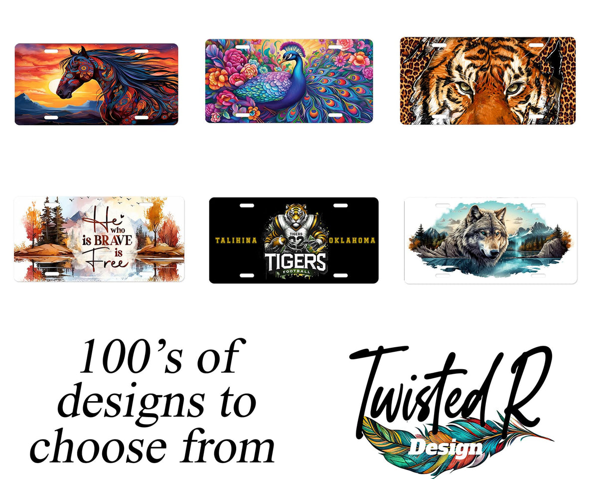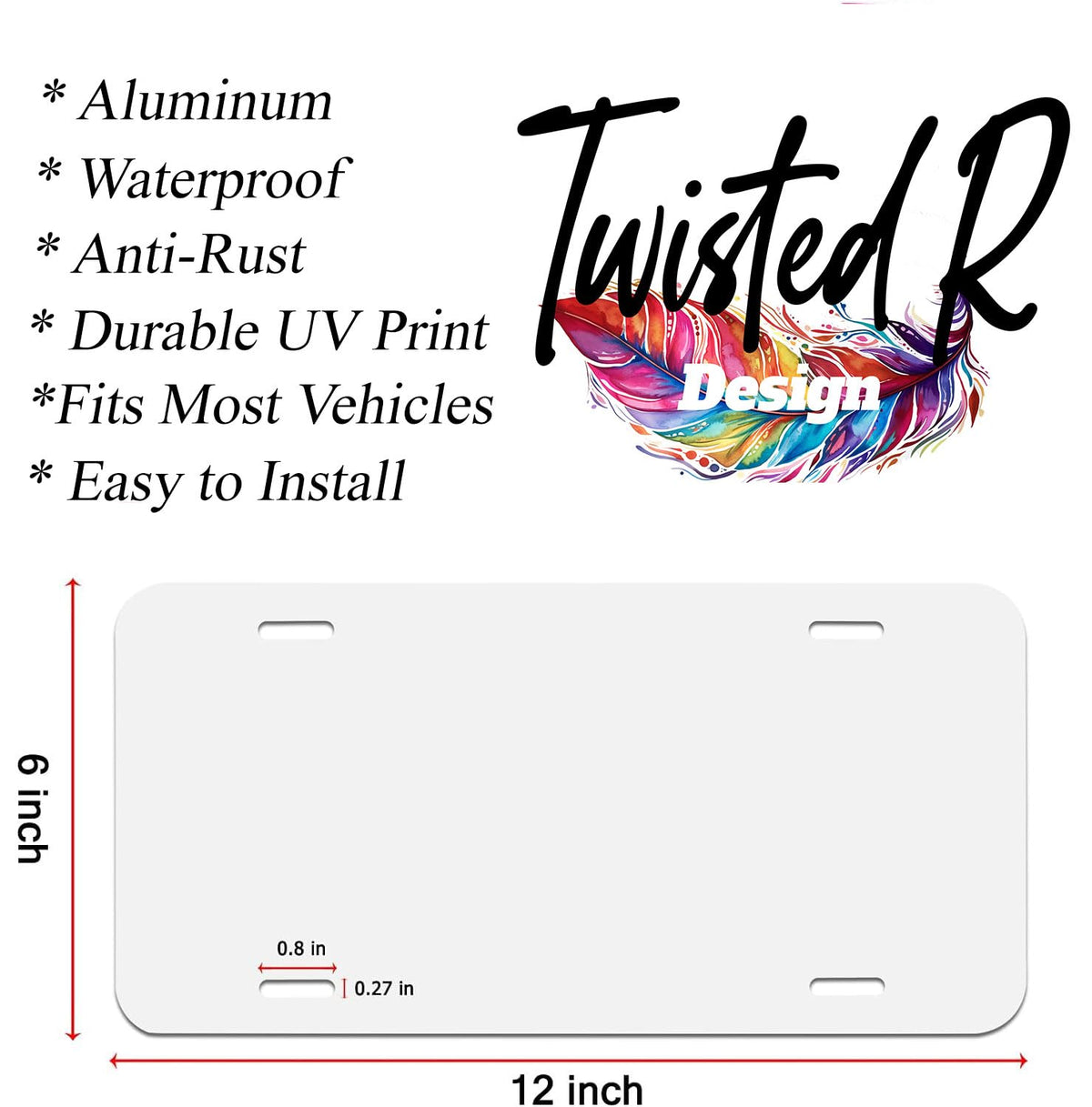 Aluminum License Plate Each license plate sign is 12 inches wide by 6 inches high and made from thin .25 white aluminum. the license plate comes with 4 standard mounting holes and is printed directly onto the license plate, (not a vinyl sticker) for a durable finish. Stock Photo Each item is hand made here in our Central Texas shop