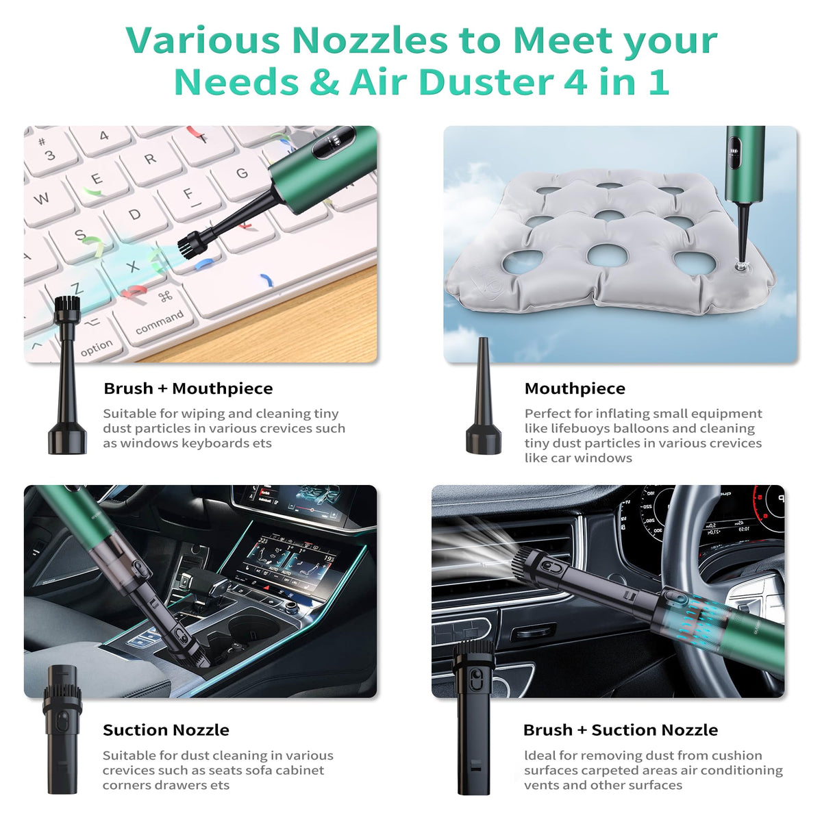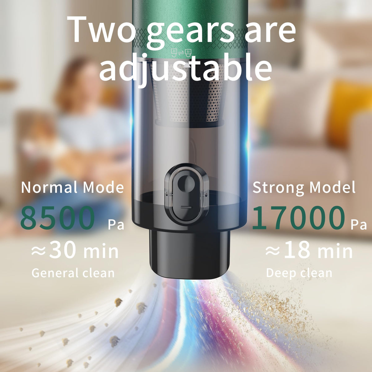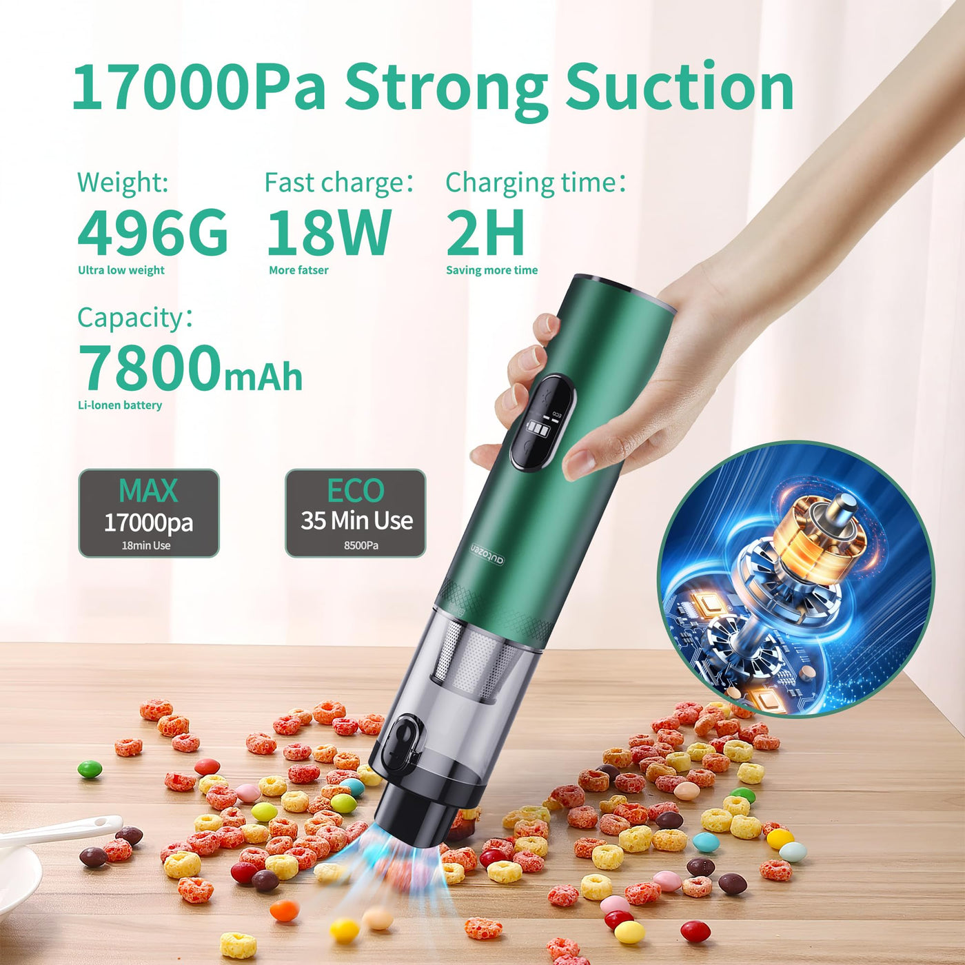 7800mAh capacity and 17000Pa suction - Redefine your cleaning experience with our latest portable vacuum cleaner! Powered by a self-developed 17000Pa high-performance motor, it operates quietly at just 65dB for a peaceful cleaning experience. Equipped with a 7800mAh large-capacity battery, it delivers extended runtime and supports fast charging in just 2 hours. The dual filtration system (HEPA filter + stainless steel filter) efficiently captures 95.99% of dust and particles, ensuring a cleaner and healthier environment | Multi-purpose Versatility - Our dust buster hand vacuum also serves as a blower, inflator, and pump. Equipped with combinable practical accessories, it's designed to tackle a variety of tasks from cleaning hard-to-reach car corners to inflating swim rings and even helping to start a BBQ fire. Ideal for car detailing, home cleaning, and outdoor activities | Two Modes - This small handheld vacuum features a one-touch dust extraction system for easy maintenance and a washable HEPA filter for long life and environmental friendliness. It offers two suction modes - Eco (30 mins) and Max (18 mins) - and the Type-C universal charging port takes the hassle out of finding a dedicated charging cable | Practical and stylish - Elevate style and function with a premium design. Crafted with a one-piece anodized aluminum alloy body, this vacuum is lightweight, durable, and stylish, with a diamond-textured, non-slip grip for comfort. The LED display shows battery life, while the built-in LED light illuminates dark areas for thorough cleaning. Beautifully packaged with a spare HEPA filter and a velvet storage bag, it makes an ideal gift for any occasion | After-sales Service - autozen mini vacuums are all manufactured under strict quality standards to offer our customers best experience. We provide a 1-year warranty and 24-hour support for any questions or issues. Note: The charger is not included, and the hand vacuum cannot be operated during charging. For optimal performance, it is recommended to regularly maintain the dust bin and filter