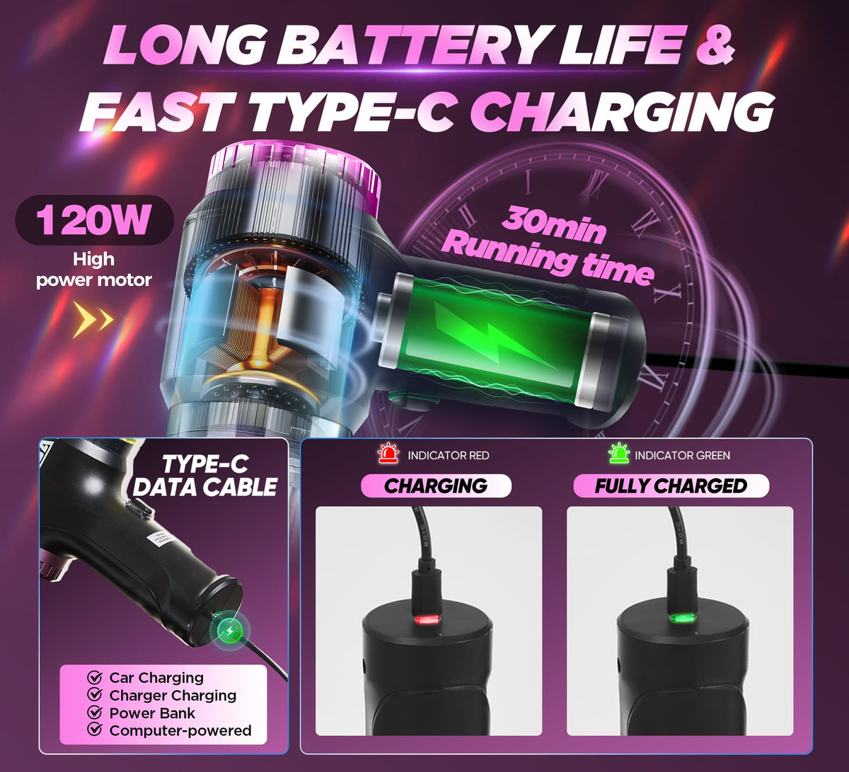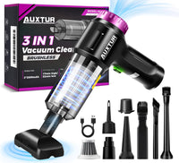 Introducing the AUXTUR Handheld Vacuum, the ultimate solution for keeping your car clean and spotless. With its powerful suction, cordless design, and versatile functionality, this vacuum cleaner is a must-have for every car owner. Featuring an impressive 12000PA strong suction power, the AUXTUR Handheld Vacuum effortlessly picks up dirt from every nook and cranny of your vehicle. No more worrying about stubborn pet hair or sand ruining your car's interior - this vacuum can handle it all with ease. Forget about tangled cords and limited mobility. Our cordless and rechargeable design allows you to freely move around your car without any restrictions. The included Type-C data cable ensures quick and convenient charging, making sure your vacuum is always ready for use. Not just limited to vacuuming, this 3-in-1 device also doubles as a blower and pump. Use it to inflate air mattresses, pool toys, and more, or effortlessly blow away leaves from hard-to-reach corners. Included components such as the brush attachment make tackling different surfaces a breeze. From upholstery to dashboard, this handheld vacuum is designed to handle every aspect of car cleaning. With its compact form factor and lightweight design, this portable vacuum is easy to handle and store. Whether at home or on the go, it's the perfect companion for quick cleanups and maintaining a tidy car interior. Say goodbye to bulky and underperforming vacuums. The AUXTUR Handheld Vacuum delivers 12000PA super suction power in a compact package. Experience the convenience of a cordless vacuum that's ready to tackle any mess - from small to larger. Invest in the cleaning solution that offers the best suction power, portability, and versatility - choose the AUXTUR Handheld Vacuum. Keep your car clean, fresh, and effortlessly tidy. Order yours today and transform your car cleaning routine.