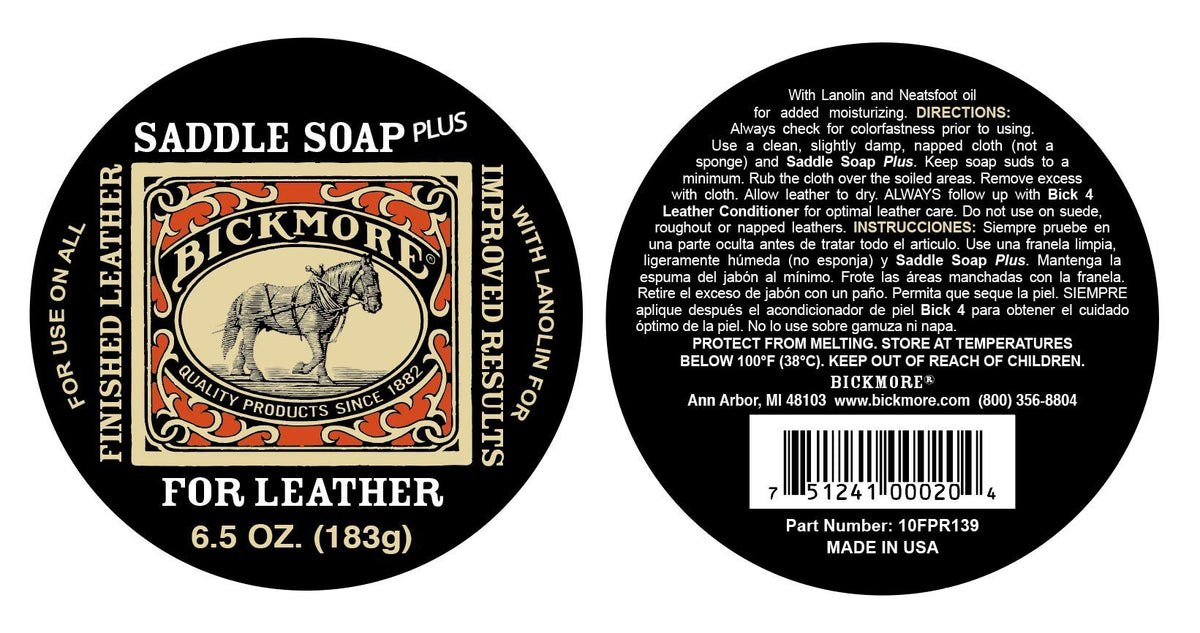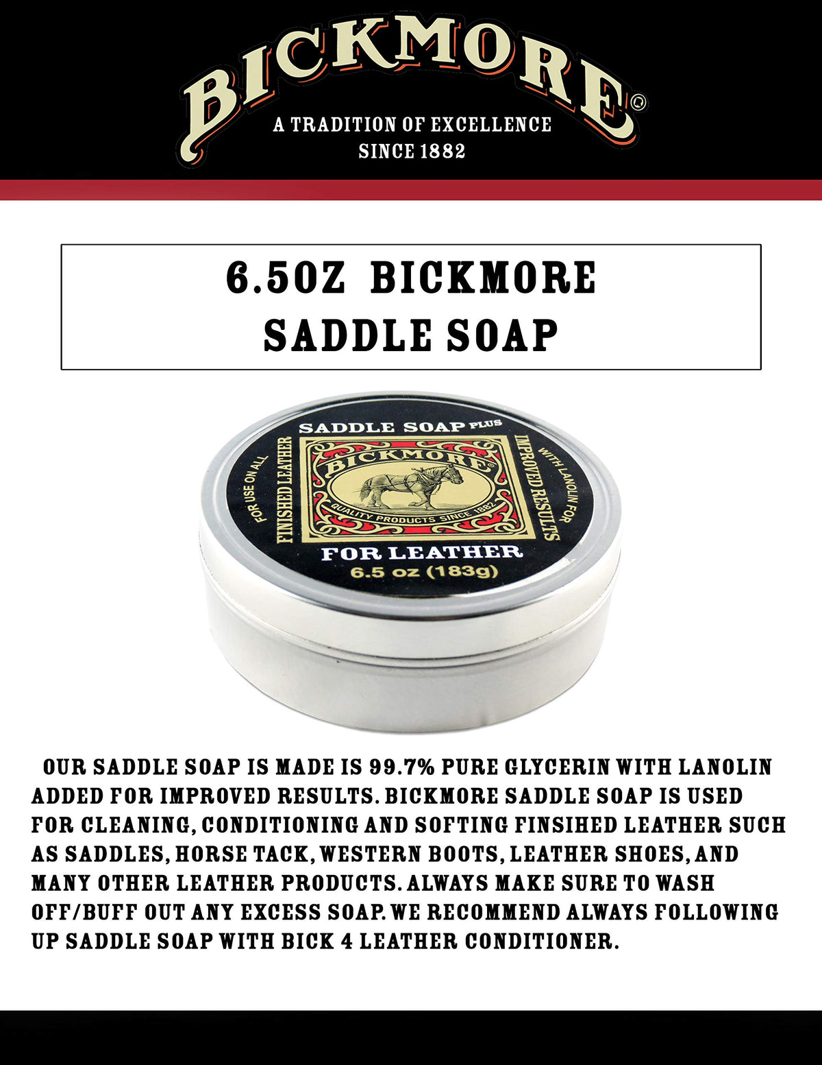 Product Use: Bickmore Saddle Soap Will Work On Saddles, Headstalls, Bridles, Reins, Tie-Downs, And Any Other Horse Tack. Saddle Soap Is Also Great For Leather Boots, Leather Shoes, And Even Outdoor Leather Products Such As Baseball Gloves. Directions: Always Check For Colorfast Prior To Using. Use A Clean, Slightly Damp, Napped Cloth (Not A Sponge) To Apply The Soap. Make Sure To Keep Soap Suds To A Minimum. Rub The Cloth Over The Soiled Areas. Remove Any Excess Soap With A Clean Cloth. Always Follow Up This Process With Bick 4 To Rehydrate Leather For Optimal Care. Do Not Use On Suede, Roughout Or Napped Leathers. Customer Satisfaction: Our Goal Is 100% Customer Satisfaction At All Times. If You Are Unhappy With Our Product For Any Reason Please Contact Us And We Will Do Everything We Can To Make It Right.