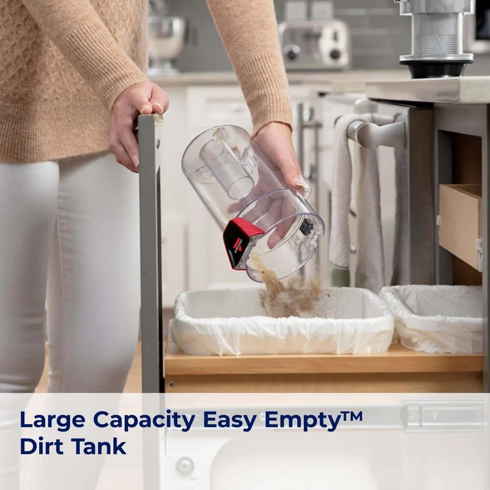 Q: How do I maintain the Easy Empty Dirt Tank?A: The Easy Empty Dirt Tank has a 0.5L capacity, allowing you to control dirt and debris while emptying. To maintain it, simply detach the tank, hold it over a trash bin, and press the release button to dispose of the contents without touching the mess.