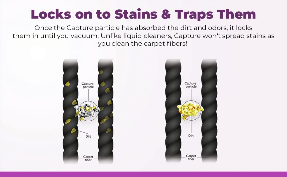 Q: How does the Capture Dry Cleaning Powder work?A: The Capture Dry Cleaning Powder is composed of tiny particles that act like super sponges, absorbing dirt and spills. Once the powder comes into contact with a stain, it binds to the stain particles, preventing them from reappearing when vacuumed.