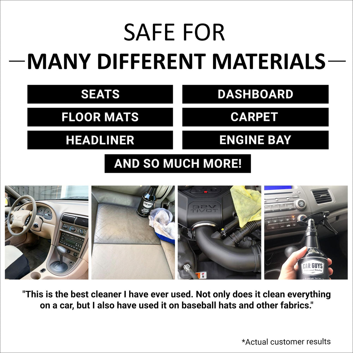 Q: Is the CAR GUYS Super Cleaner safe for all materials?A: While the CAR GUYS Super Cleaner is safe for a wide range of materials including upholstery, fabric, leather, vinyl, and rubber, it is not recommended for use on glass and delicate instrument panel screens.