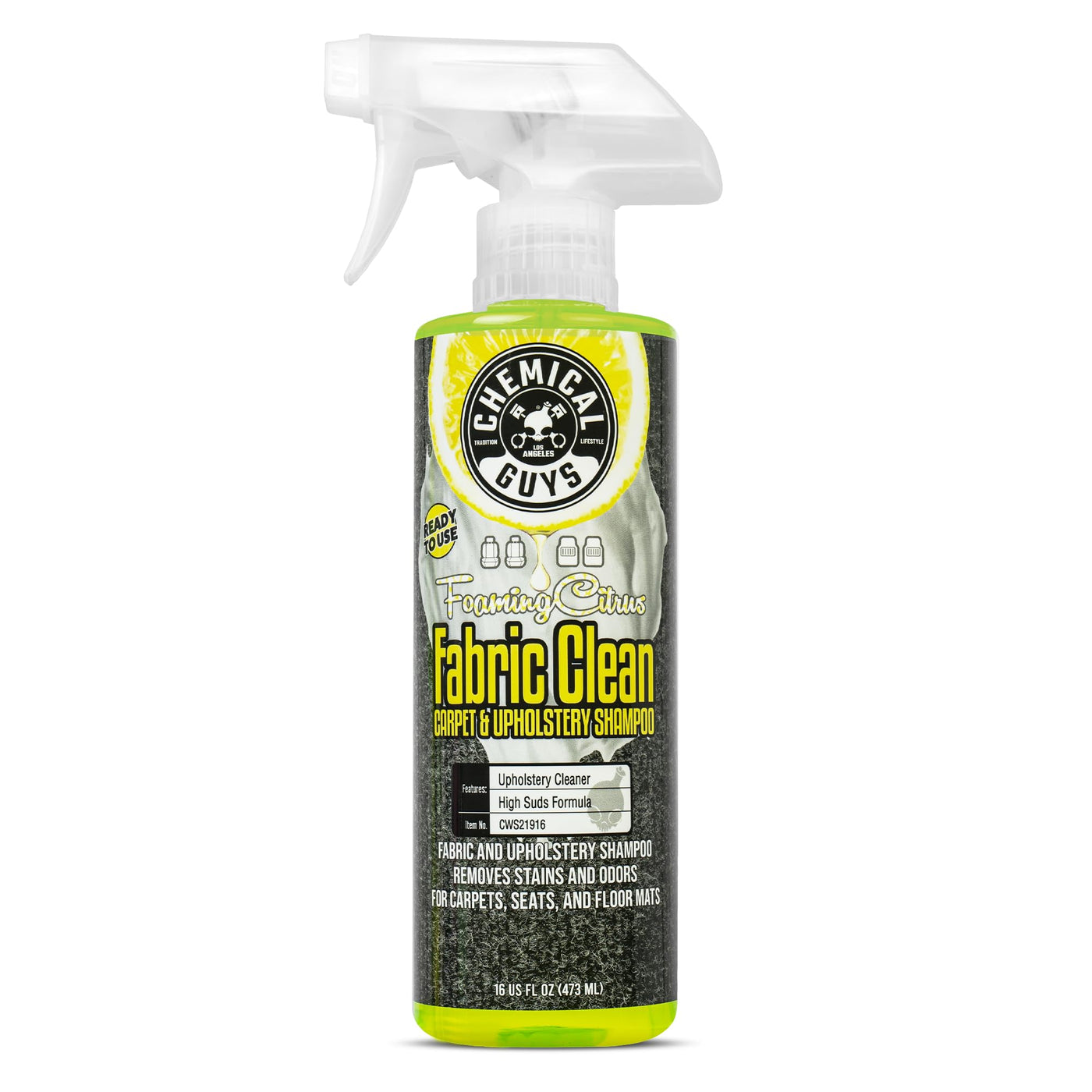 Introducing Foaming Citrus Fabric Clean Carpet and Upholstery Shampoo Ready To Use - now in a convenient sprayable form! The fastest and strongest spot and stain remover shampoo!Fabric Clean effortlessly dismantles and eradicates stubborn stains on a wide range of indoor and outdoor fabrics, upholstery, and carpets, ensuring a thorough and safe clean. This remarkable formula marries a top-tier biodegradable degreaser with an enzymatic odor eliminator, ensuring immediate odor control and long-lasting, deep-cleaning results that harness the power of biotechnology.There are no chemicals, ammonia, bleach, color-damaging detergents, or solvents. This biodegradable formula removes oil, grease, dirt, coffee, tea, wine, juice, and pet stains from any water-safe indoor or outdoor fabric.The foaming action isn't just for show; it plays a crucial role. Fabric Clean's oxygen-infused cleansers work diligently to lift and dislodge dirt particles and stains deeply embedded within carpets and upholstery.How to Use:1. Shake well.2. Dilute as desired.3. Vacuum area to remove any loose dirt and debris.4. Spray product on surface to be cleaned.5. Agitate area gently with a brush.6. Blot and wipe area dry with a premium microfiber towel.7. Vacuum or use extractor for superior results.Visit the Chemical Guys Store on Amazon to see our entire Arsenal; find Pro Tips, Special Promotions, and New Product Launches; Link at the top of the page, Click Follow!Works safely on all automotive vehicle brands including: Acura, Audi, BMW, Buick, Cadillac, Chevrolet (Chevy), Chrysler, Dodge, Fisker, Ford, GMC, Honda, Hummer, Hyundai, Infiniti, Isuzu, Jaguar, Jeep, Kia, Land Rover, Lexus, Lincoln, Mazda, Mercedes, Mercury, Mini, Mitsubishi, Nissan, Pontiac, Porsche, RAM, Saab, Subaru, Tesla, Toyota, Volkswagen, and Volvo; and RV brands like Coachmen, Entegra, Forest River, Newmar, Thor Motor Coach, Winnebago, AirStream, K-Z, Keystone and Midwest Automotive Designs.