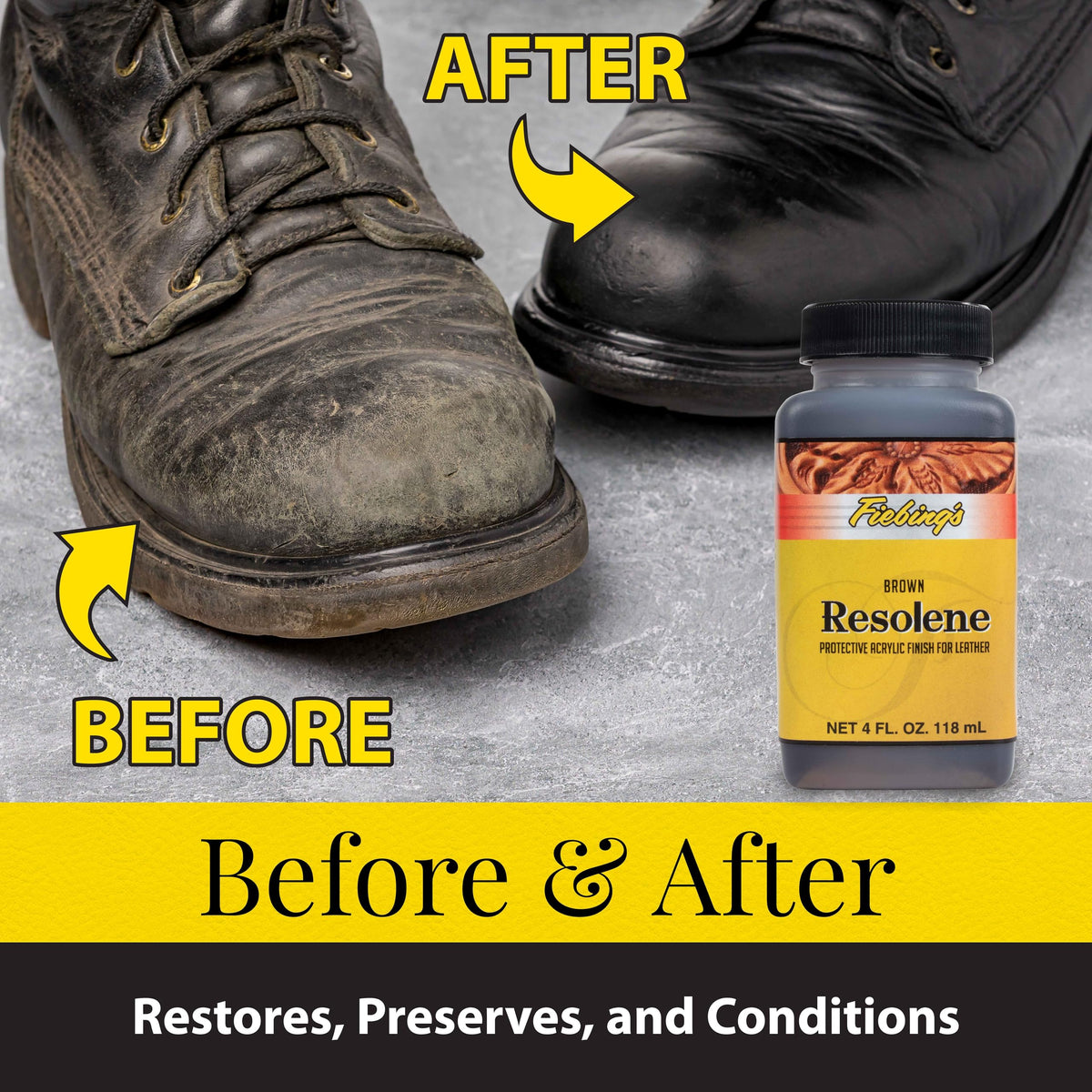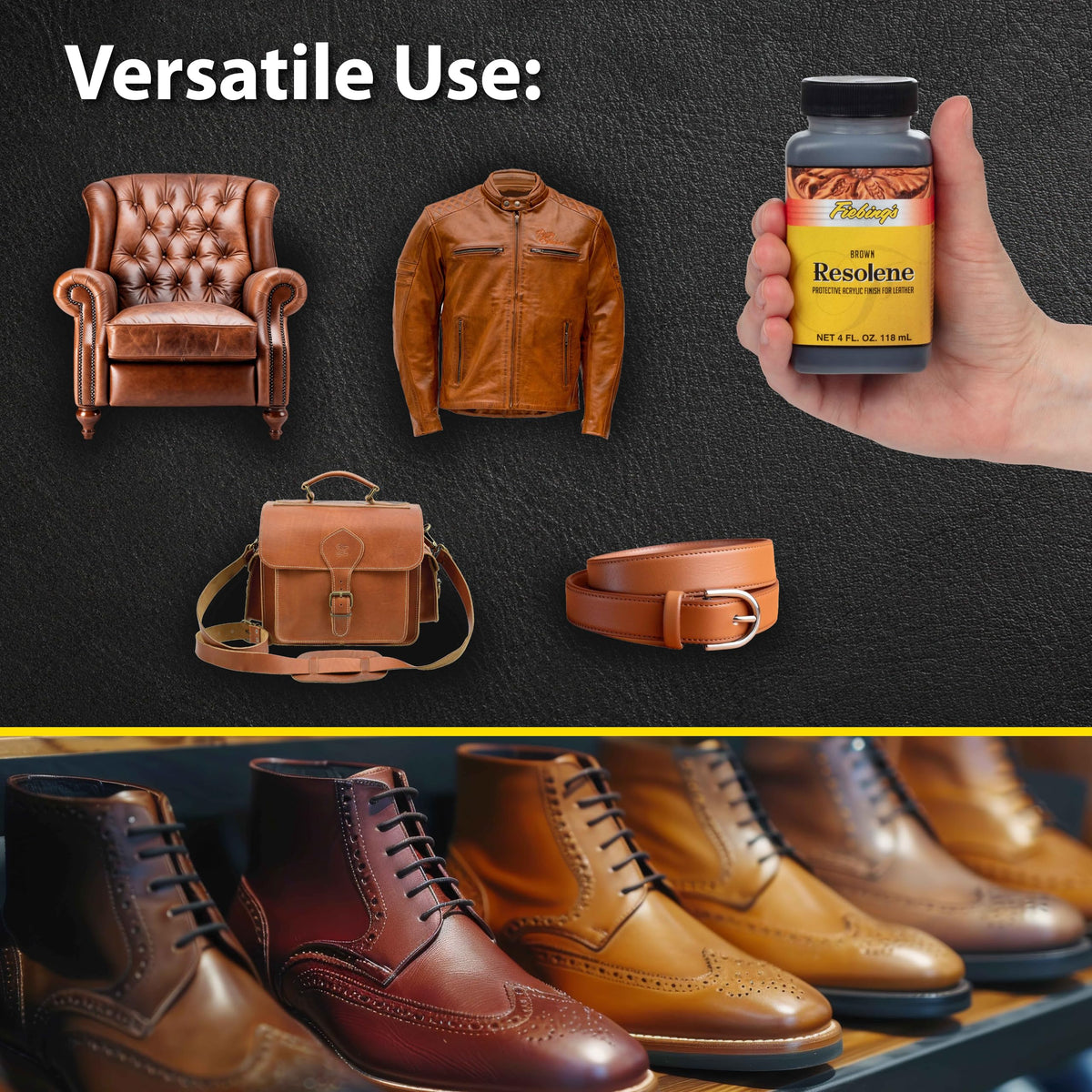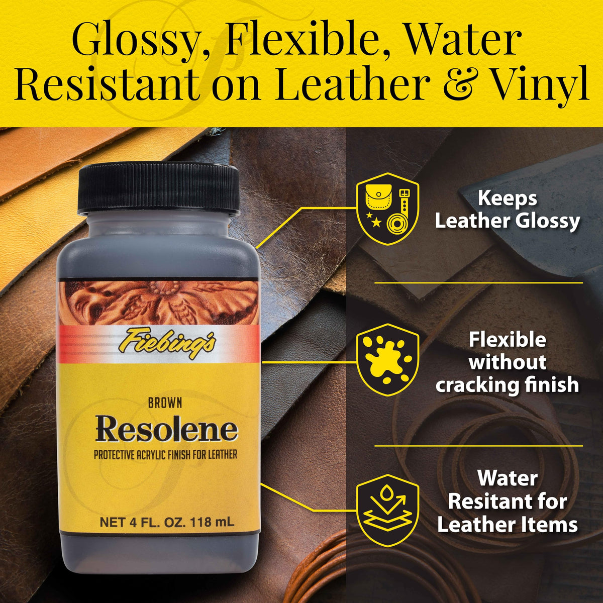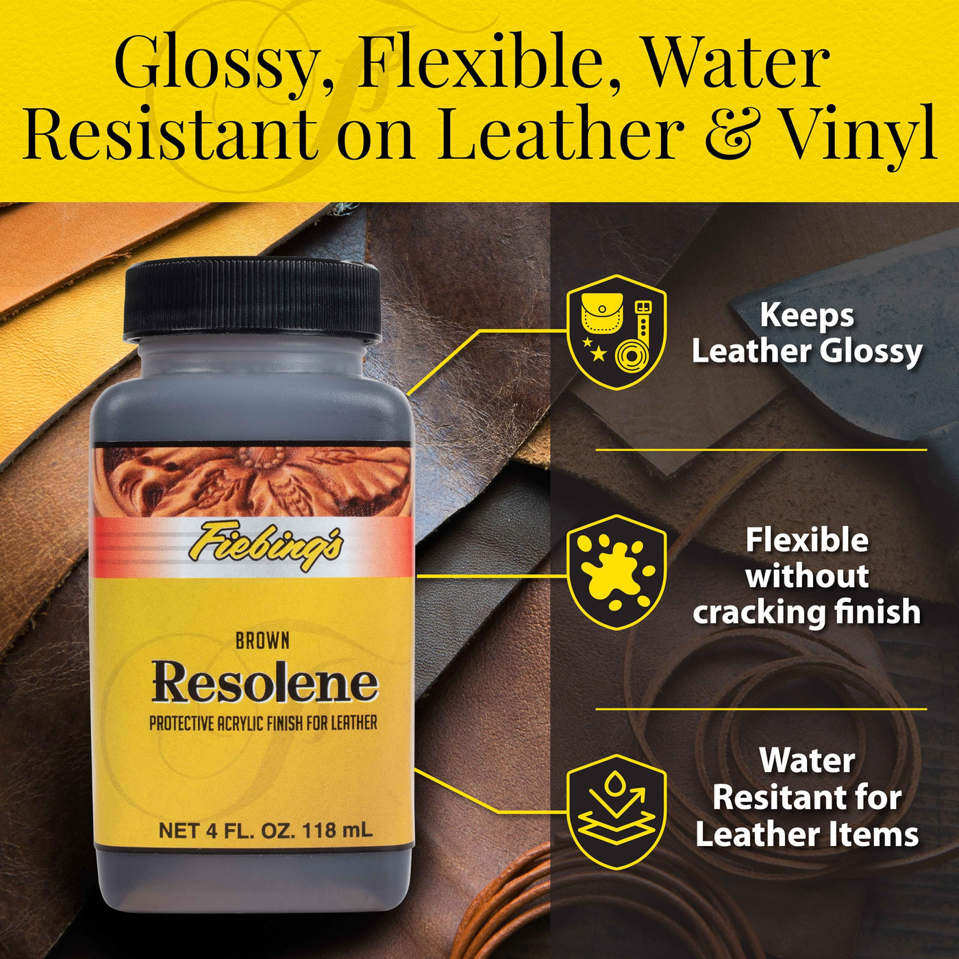 Fiebing'S Brown Acrylic Resolene, 4 Oz. - Protects Leather Finish - Our Most Popular Top Finish For Use Over Dyed, Antiqued Or Polished Leathers.. Acrylic Resolene Is Flexible, Durable And Water Resistant. Best Applied With A Damp Sponge. (Tip: Resolene Goes On With A Slight Blue Tint But When Dry Results In A Gorgeous Gloss Finish.)