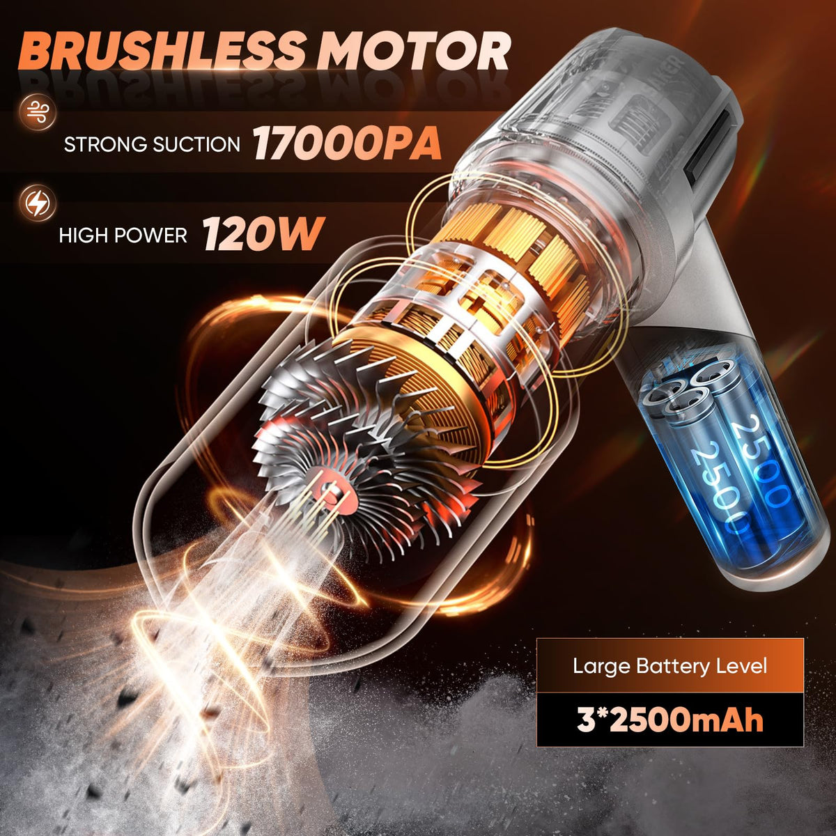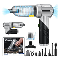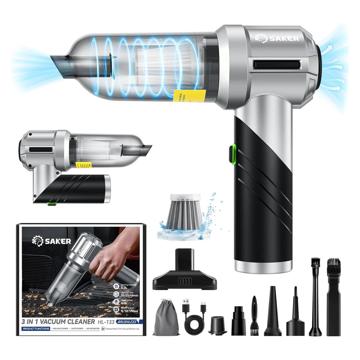 Q: What is the suction power of the Saker Portable Handheld Vacuum?A: The Saker Portable Handheld Vacuum features an impressive suction power of 17000PA, thanks to its upgraded high-speed brushless motor. It offers three-speed suction adjustments ranging from 7KPA to 15KPA, making it effective for cleaning various debris like sand, dust, and pet hair.