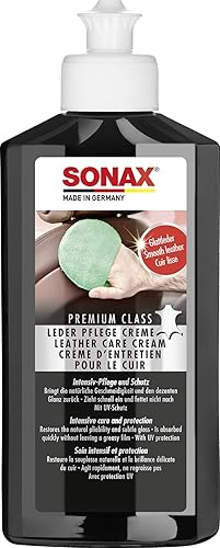 SONAX Premium Class Leather Care Cream restores the leather's original, subtle shine, intensive color and natural smoothness. Moisturizing active ingredients nourish the leather, maintain the permeability and increase the life. The products UV filters protect the leather against color fading when exposed to sunlight. Anti-creaking additives ensure a comfortable seating sensation without seeming slippery. Thanks to the addition of antioxidants, the leather's natural deterioration due to ageing is stopped. The treated surface has a hydrophobic effect and forms a protective barrier against dirt, water, spillages, etc. Suitable for all smooth leather, also for perforated leather surfaces and seats with seat heating. Do not use on aniline, nubuck, velours or suede leathers. Use with SONAX Care Pad for Plastics (Item No. 417200) and SONAX Microfiber Drying Cloths (Item No. 450800).