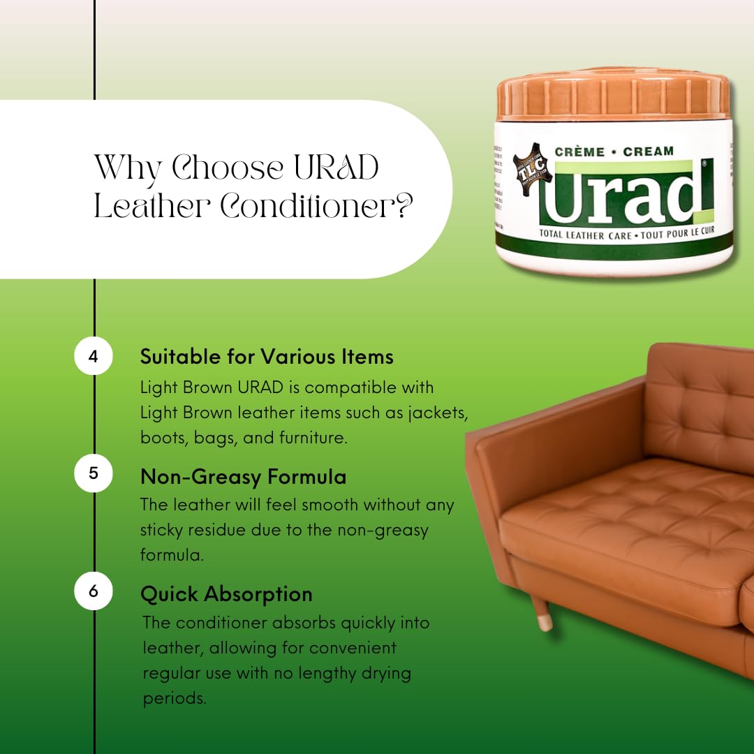 Revitalize And Protect Your Leather With Urad Leather Conditioner 7Oz In Light Brown. This Premium Leather Cream Is Formulated To Nourish, Restore Color, And Add A Lustrous Finish To Light Brown Leather Surfaces. Perfect For Leather Furniture, Couches, Car Seats, Shoes, Bags, And Jackets, Urad Leather Conditioner Deeply Penetrates To Restore Essential Oils, Prevent Cracking, And Maintain The Original Shade Of Your Leather. With Easy Application And A Color-Matching Formula, Urad Ensures Light Brown Leather Looks As Vibrant As New. Choose Urad For Long-Lasting, Superior Leather Care.