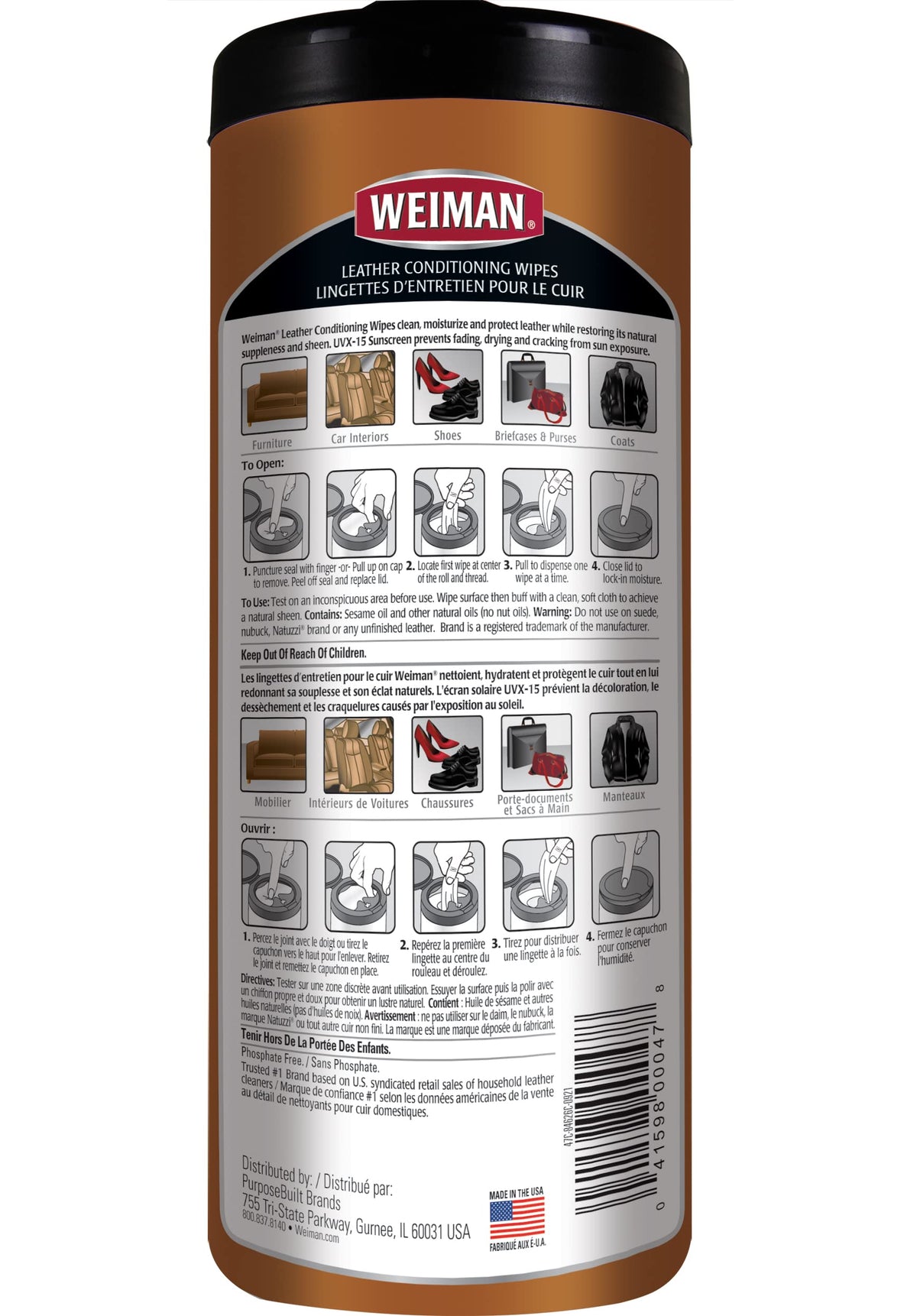 Q: How do I use Weiman Leather Wipes for cleaning leather?A: To use Weiman Leather Wipes, simply take a wipe from the package and gently rub it on the leather surface you wish to clean. The wipes not only clean but also condition the leather in one step.