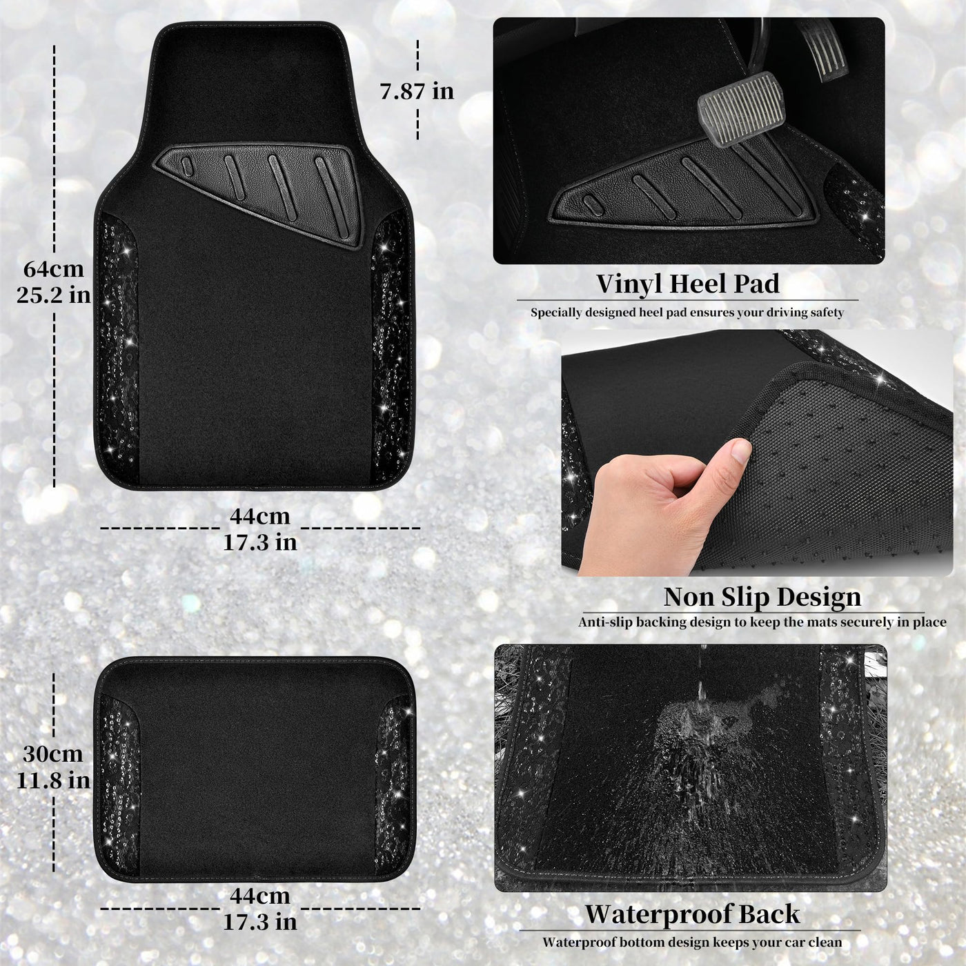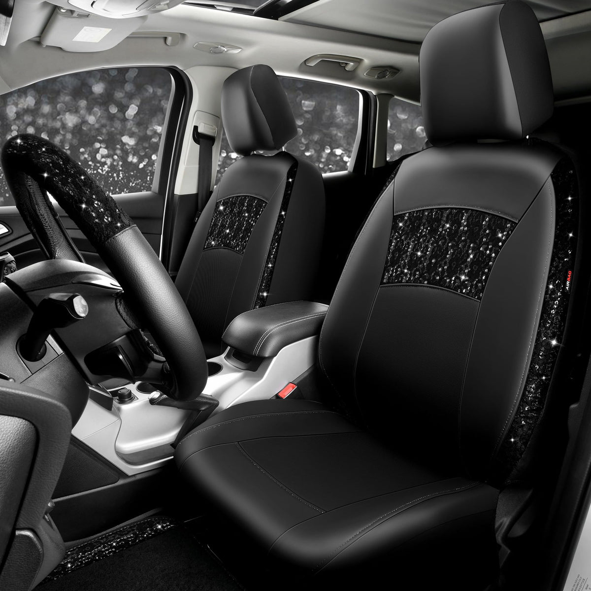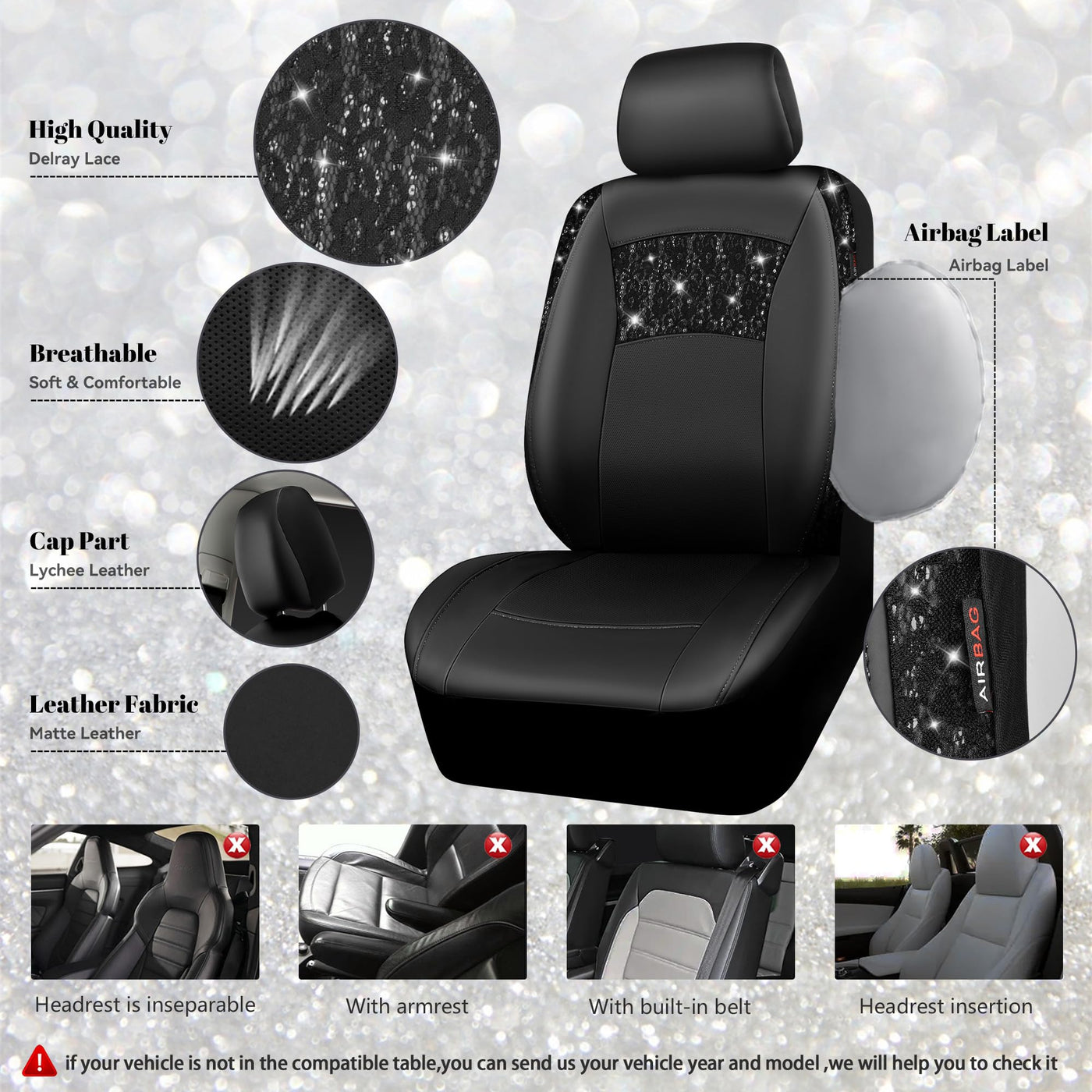 Car Pass Universal Black Leather Lace Car Seat Covers Full Set For Women Girls,Waterproof Car Floor Mats Carpet,Glitter Steering