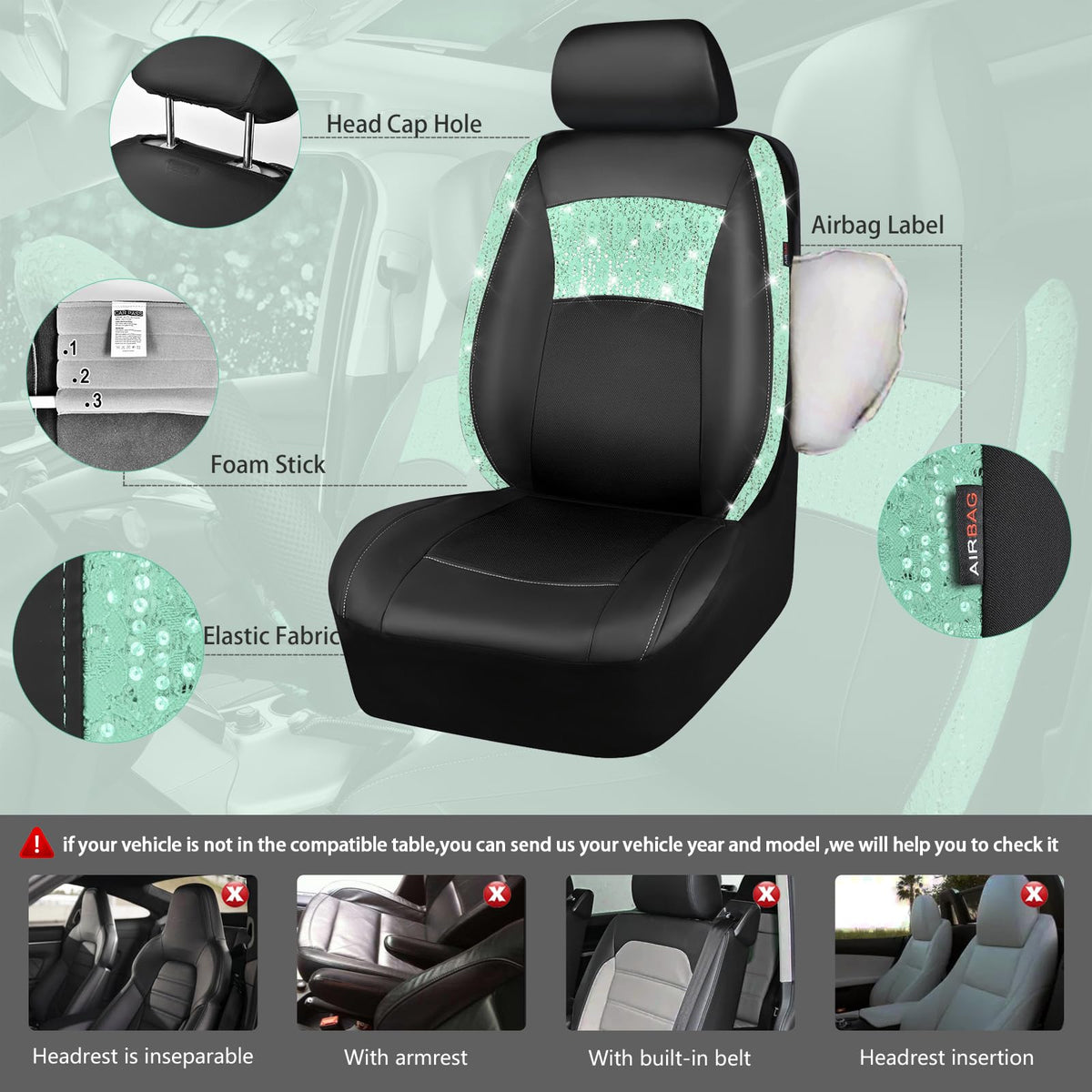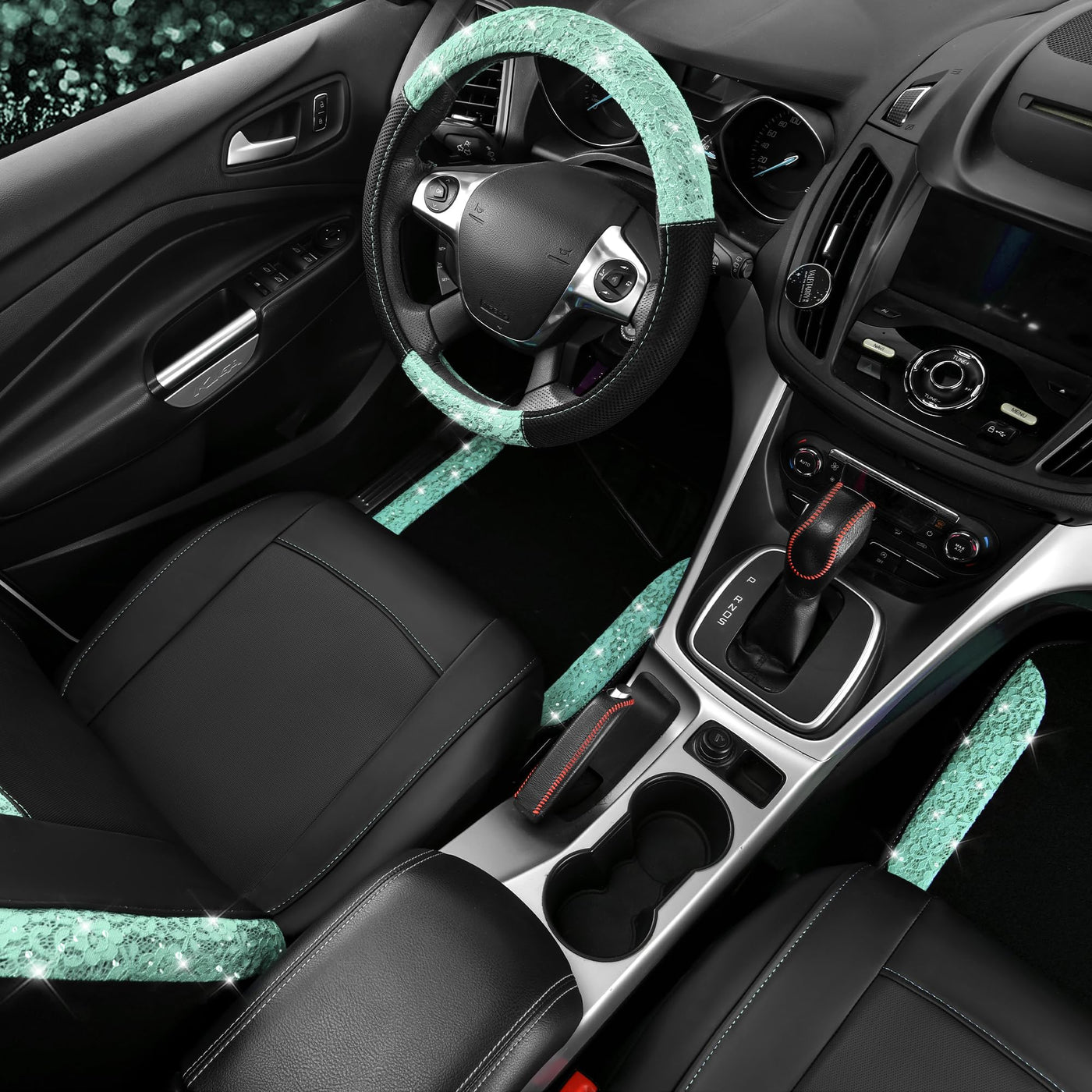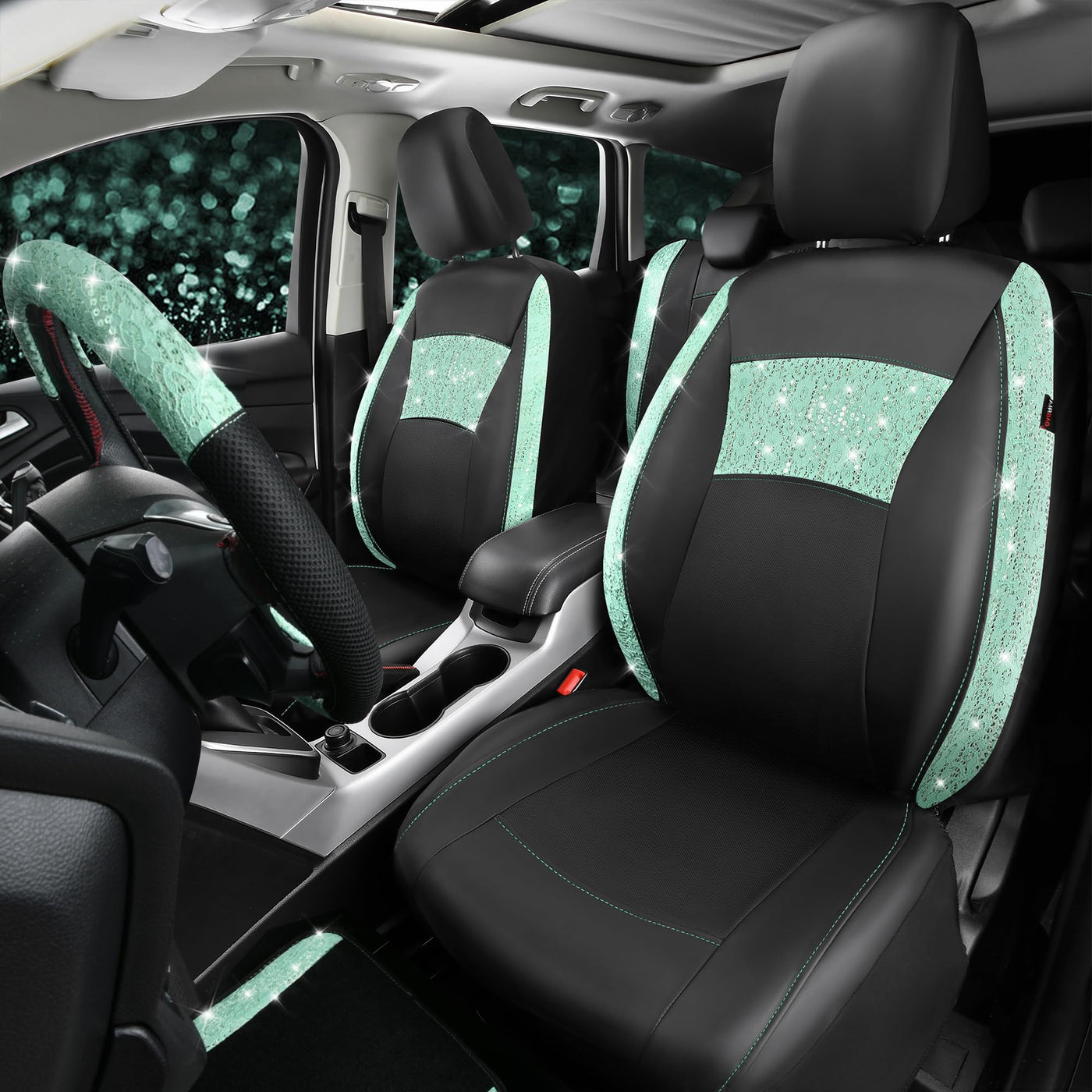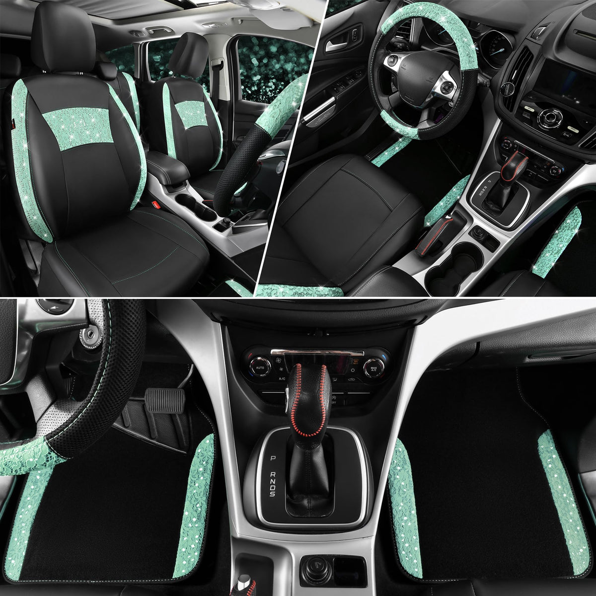 Car Pass Universal Mint Leather Lace Car Seat Covers Full Set For Women Girls, Waterproof Car Floor Mats Carpet, Glitter Steerin