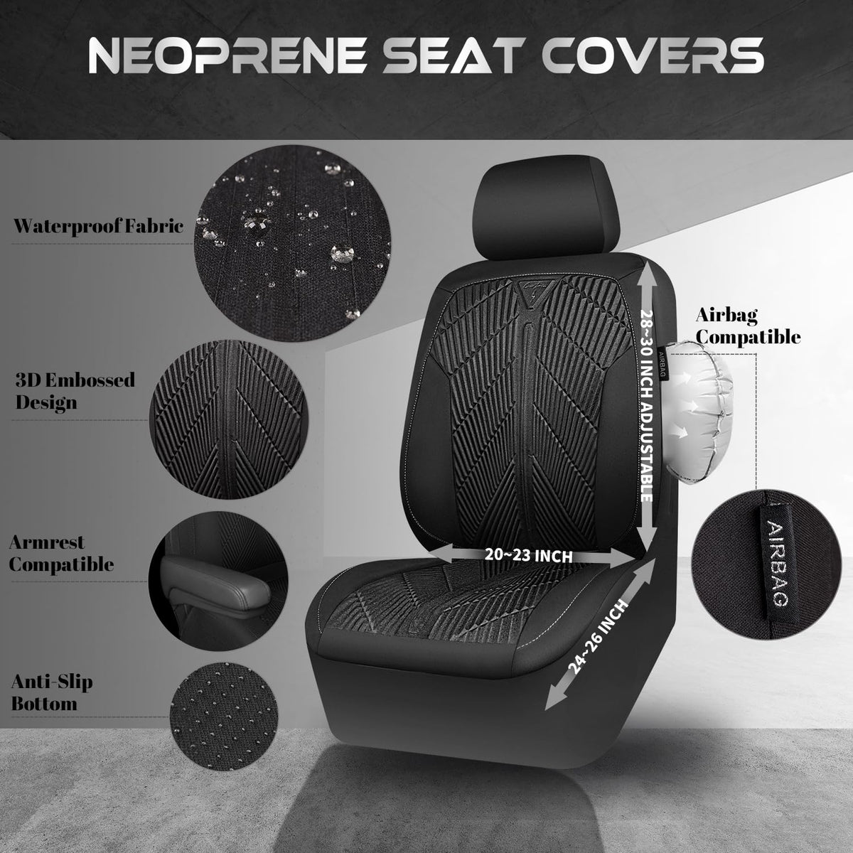 CAR Pass Waterproof Car seat covers Front Seats covers Neoprene Wetsuit, All-Weather Non-Slip Durable, Universal Fit for SUV Sedans Trucks Vans Automotive, Armrest Airbag Compatible, Emboss 2 Black