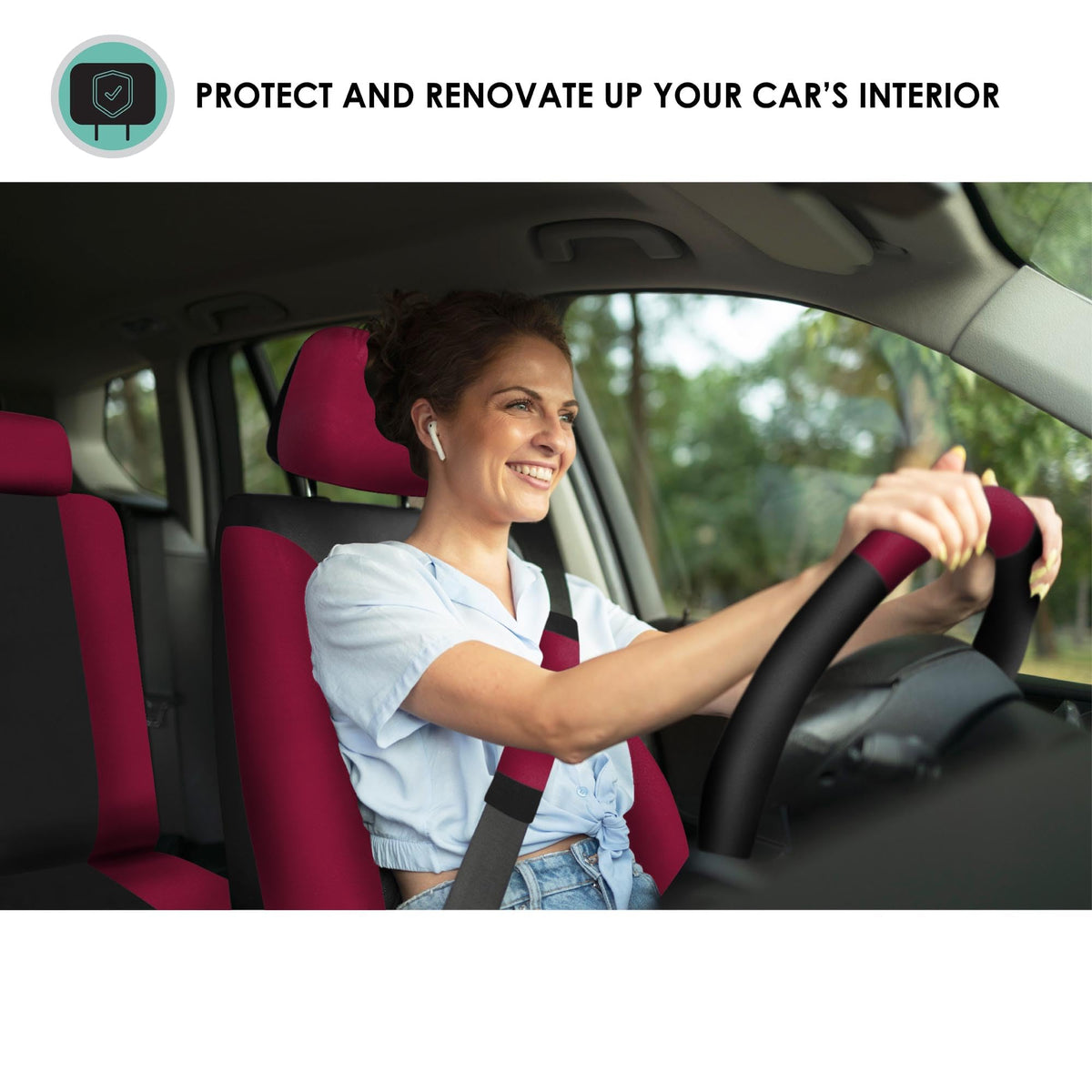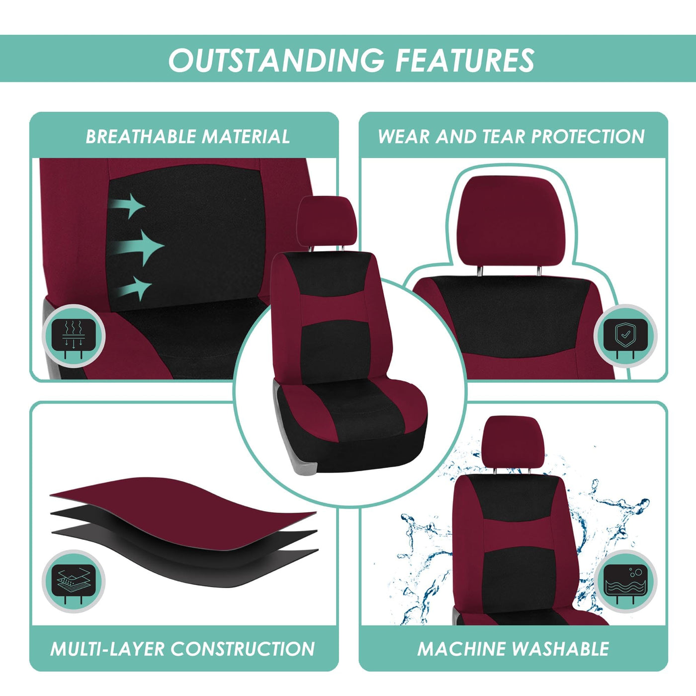FH Group got you covered! Our full set of premium cloth car seat covers not only provides the best protection for your car's upholstery against any type of mess but also enhances the looks of your car's interior. No need to worry anymore about spills, stains, mud, or anything damaging your original car seats because this car seat protector got your back. This full set of car seat covers includes two front low back seat covers, which are compatible with most sedans, SUVs, and vans seats with removable headrests only. Our rear seat covers are fully compatible with 50/50, 40/60, or 60/40 split rear benches or longer benches. The cover features 3 zippers in the backrest AND bottom, and extra mesh pieces so you can move the rear seat freely or use the middle armrests and get full protection. We understand messes happen, and thats why these waterproof and washable seat covers for cars are convenient for any type of driver. We offer automotive seat covers in numerous fabrics, colors, and designs, so you can easily find the seat cover for cars that fits your style the most. We have car seat covers for women, men, and for everyone! FH Group car seat covers are a great car interior accessory for your vehicle. We have it all: car seat covers for SUV, car seat covers for autos, car seat covers for vans, you name it!
