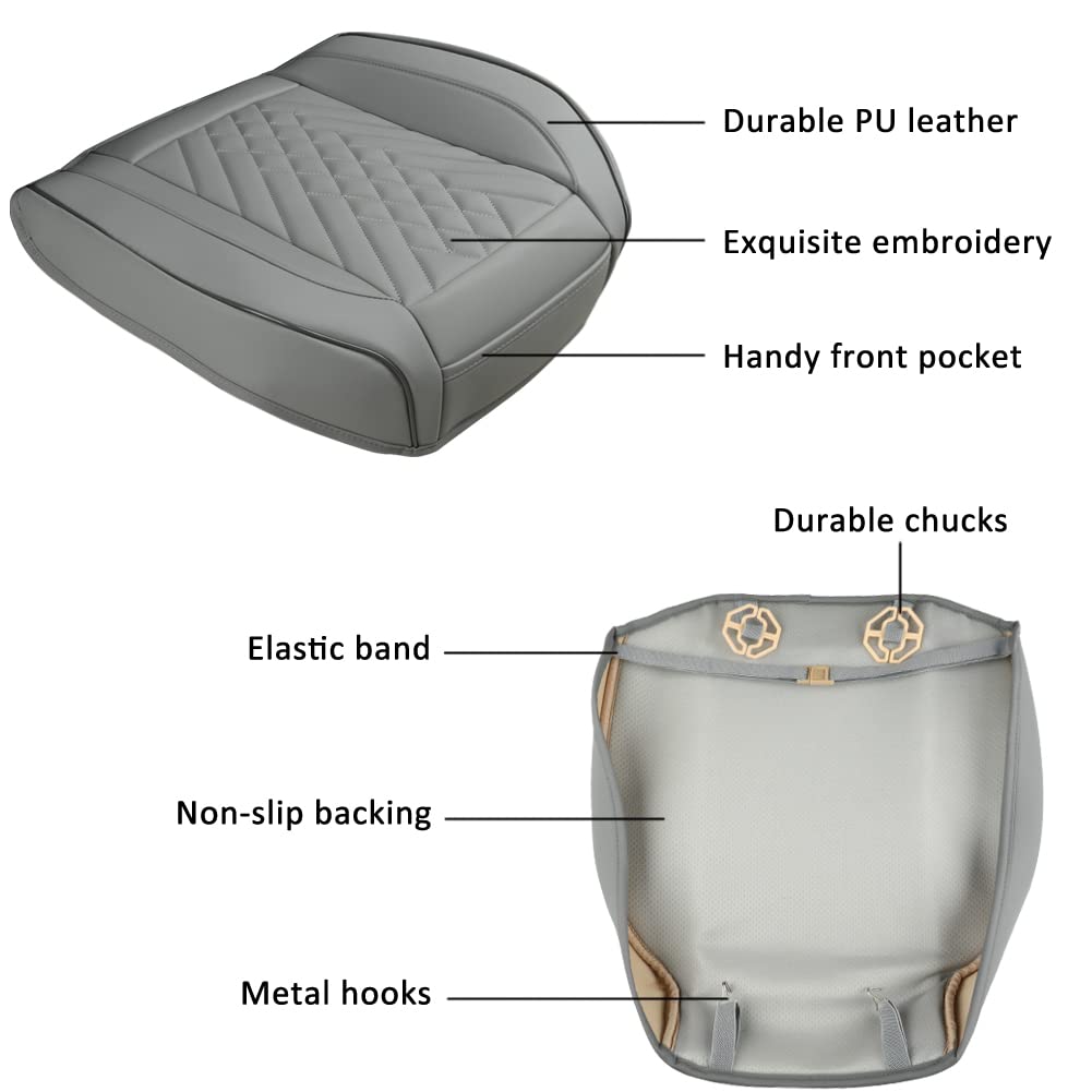 If your original seat is worn out or you want to protect your original seats, this GIANT PANDA bottom seat cover is a very affordable solution. You don't need to spend hundreds of dollars to repair your seats, this front seat cover will give it an elegant look. Product Features: - Universal Fit - Wear-resistant - Waterproof - Wrap around the bottom - With handy front pocket - Stay in place - Elegant Embroidered Design - Very easy to install - Compatible with seatbelt buckle Dimensions:W 21.26'' x D 20.86'' ( 54 x 53 cm) Available Color: Black / Grey / Beige Package Contains: GIANT PANDA Bottom Car Seat Cover x 1 Chucks x 2 Hooks x 2 Installation instruction x 1 Tip: 1. We recommend that you measure your car seat size before buying. 2. Creases will gradually flatten during use. 3. Be careful not to let the seat cover soak in water, which will reduce the life of the seat cover. 4. Please wipe with a damp cloth to clean, if you can use leather cleaning oil for better effect.