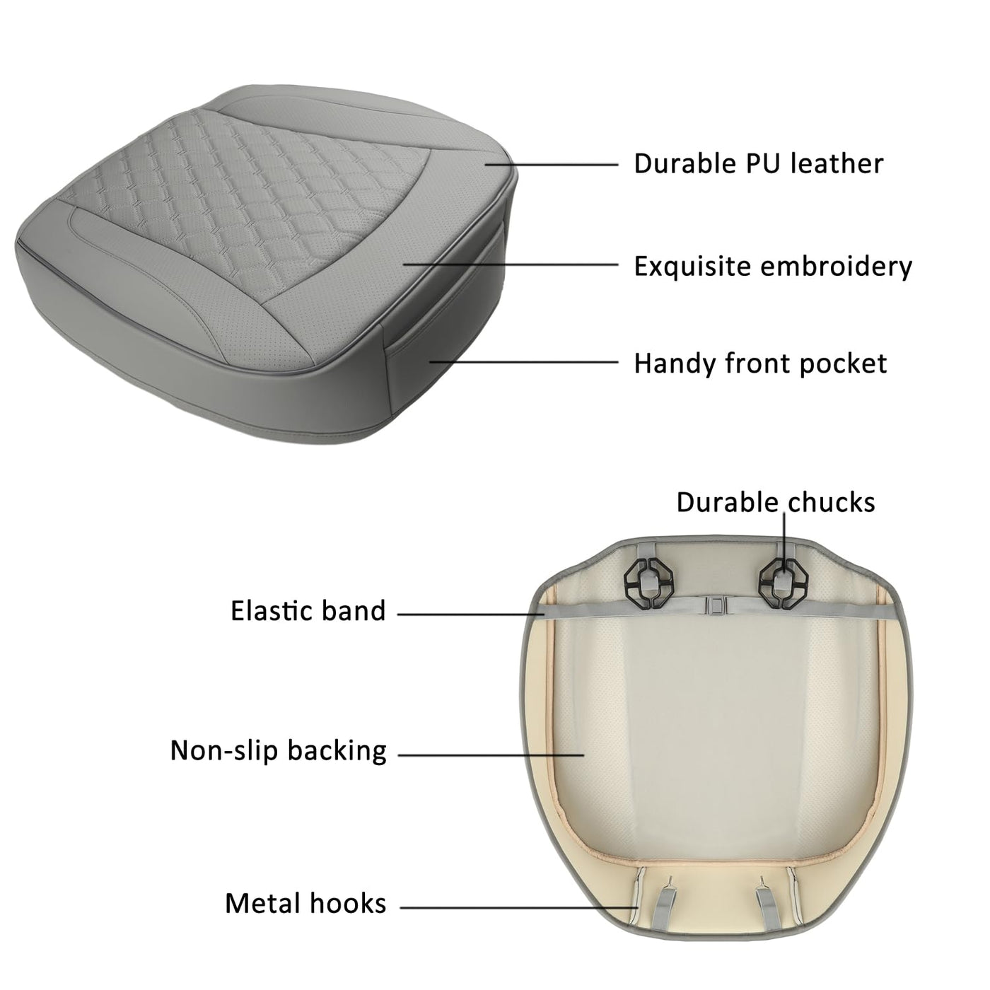 If your original seats are worn out or you want to protect them, this GIANT PANDA bottom seat covers are a very affordable solution. You don't need to spend hundreds of dollars to repair your seats, these front seat covers will give it an elegant look. Product Features: - For Trucks Fit - Wear-resistant - Waterproof - Wrap around the bottom - With handy front pocket - Stay in place - Elegant Embroidered Design - Very easy to install - Compatible with seatbelt buckle Dimensions:W 22'' x D 21'' (55 x 54 cm) Available Color: Black / Grey / Beige Package Contains: GIANT PANDA Bottom Car Seat Covers x 2 Chucks x 4 Hooks x 4 Installation instruction x 1 Tip: 1. We recommend that you measure your car seat size before buying. 2. Creases will gradually flatten during use. 3. Be careful not to let the seat cover soak in water, which will reduce the life of the seat cover. 4. Please wipe with a damp cloth to clean, if you can use leather cleaning oil for better effect.