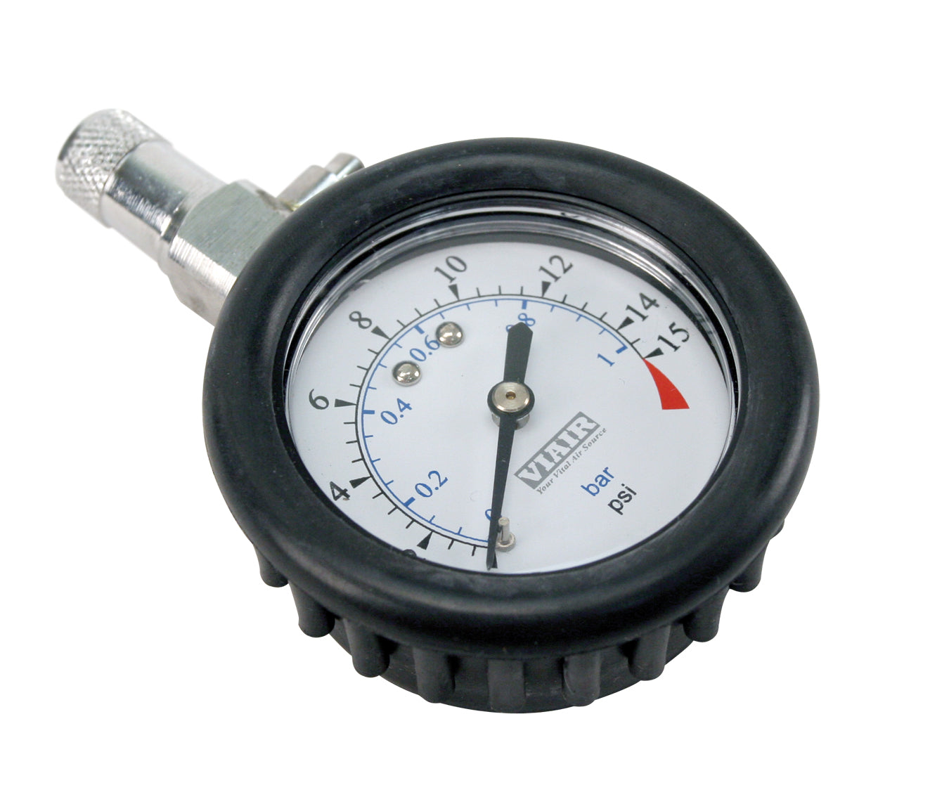 Viair 2 Inch Tire Gauge With Rubber Boot, 15 Psi. This 2'' Tire Gauge With Rubber Boot Is Designed For Rock Crawlers & Racers. Reads Pressure From 0 Psi To 15 Psi By 1/2 Psi Increments. These Gauges Are Accurate To Within 1% Tolerance Across The Entire Scale. Comes With Built-In Bleeder Valve. Warranty: 1 Year.