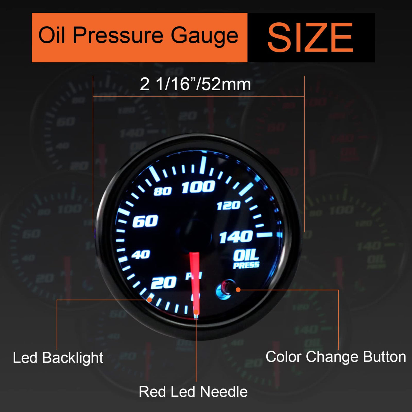 7 Color Oil Pressure Gauge 0-140 Psi Oil Press Gauge Meter 52Mm 2-1/16'' Led Backlight Black Oil Pressure Meter With Oil Pressur