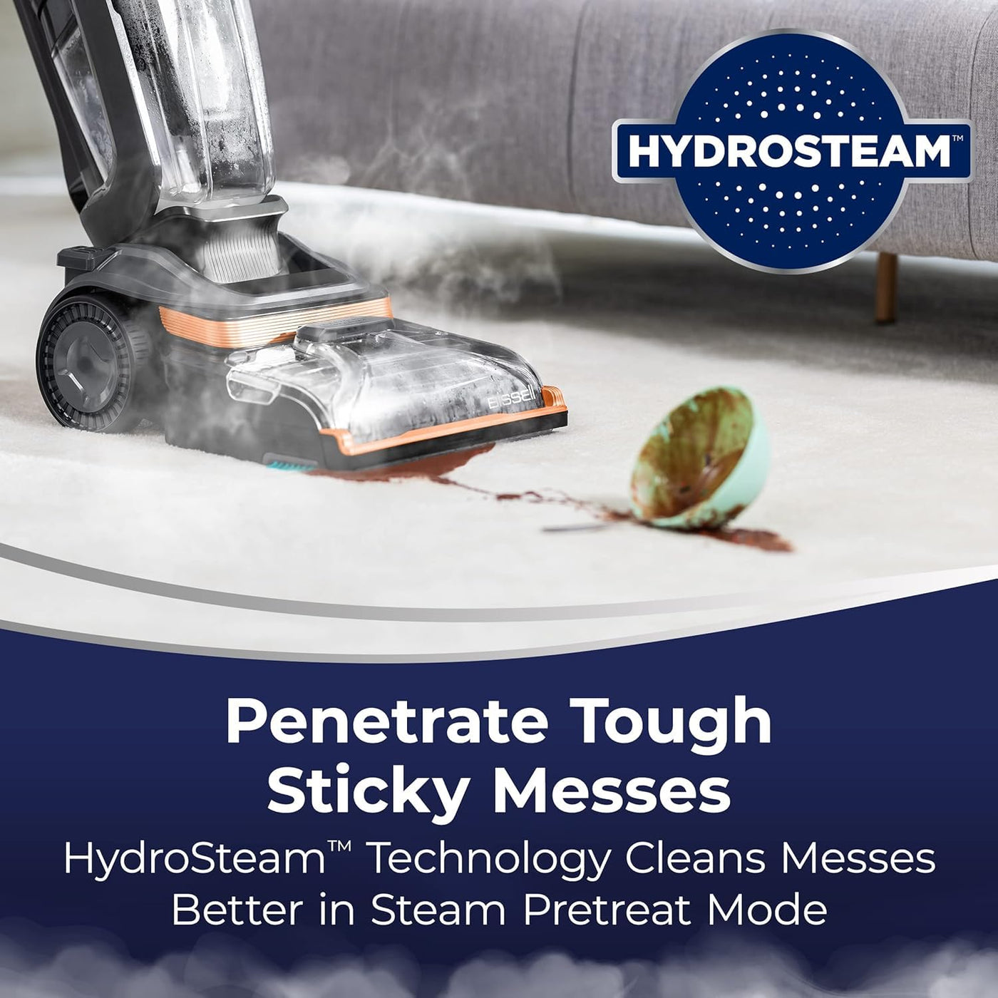 Q: What is HydroSteam Technology and how does it work?A: HydroSteam Technology is a unique feature of the BISSELL Revolution HydroSteam Pet Carpet Cleaner that allows for deep cleaning by using steam to break down tough, stuck-on messes. This technology penetrates deeply into carpets, ensuring a thorough clean while also helping to eliminate embedded dirt and allergens.