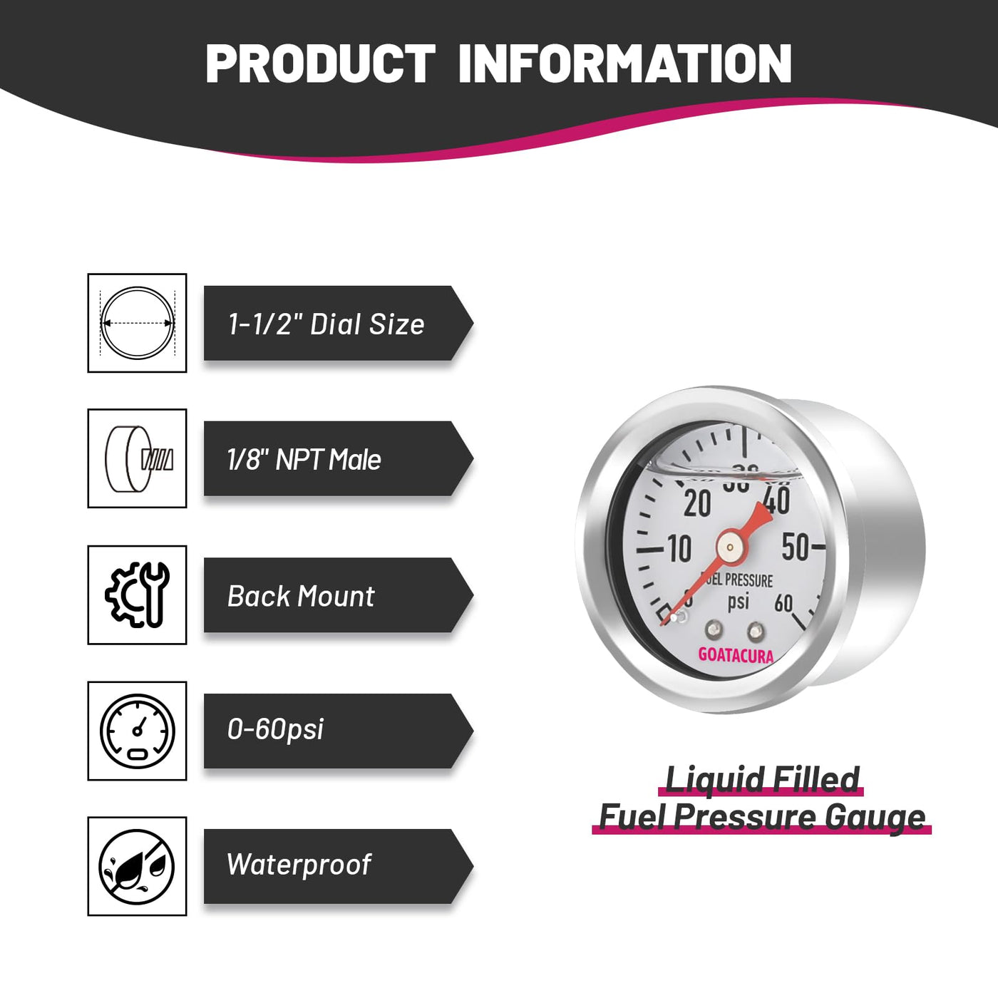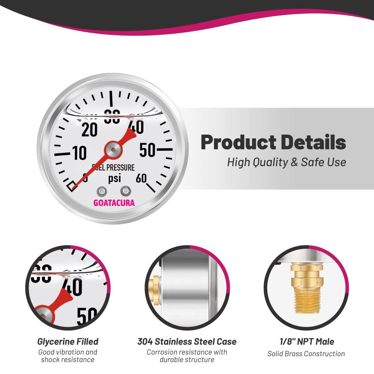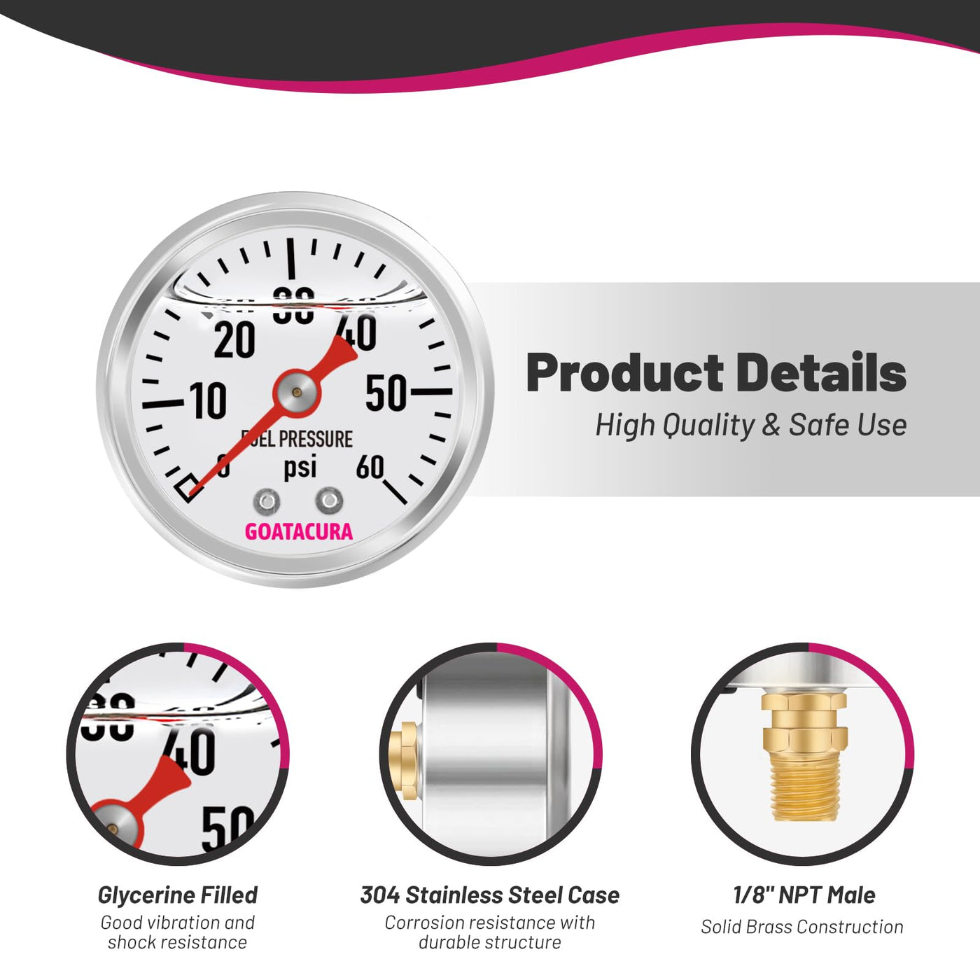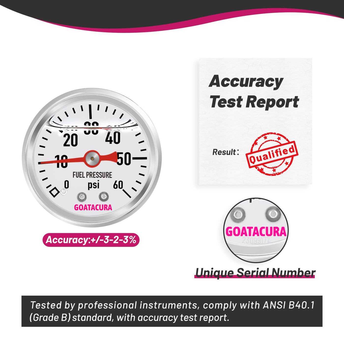 DescriptionGOATACURA liquid filled pressure gauge for measuring fuel pressure, suitable for fuel pressure regulator, applicable to measuring the pressure of liquids and gases that are not corrosive or oxidizing to brass parts. Dial Size: 1-1/2'' Thread Size: 1/8'' NPT Pressure Range: 0-60psi, single scale, clear reading Accuracy: +/-3-2-3%, comply with ANSI B40.1 (Grade B) standard, with accuracy test report Connection Location: Center back mount Connection Material: Brass Case: 304 stainless steel case Filling: Glycerin filled, enhance vibration and shock resistance, extend product life Bourdon Tube: Copper alloy Movement: Brass Dial: Aluminum, white Pointer: Aluminum, red Window: Polycarbonate Ingress Protection: IP67, waterproof Working Temperature: -4 to 140 deg F/-20 to 60 deg C Ambient Temperature: 140 deg F/60 deg C maximum GOATACURA is committed to research, develop and produce of temperature, pressure equipment etc suitable for various fields. GOATACURA pursues high-quality, high-accuracy and better service. We pay high attention to the feedback and needs of users. We continue to learn and innovate, and create better products.