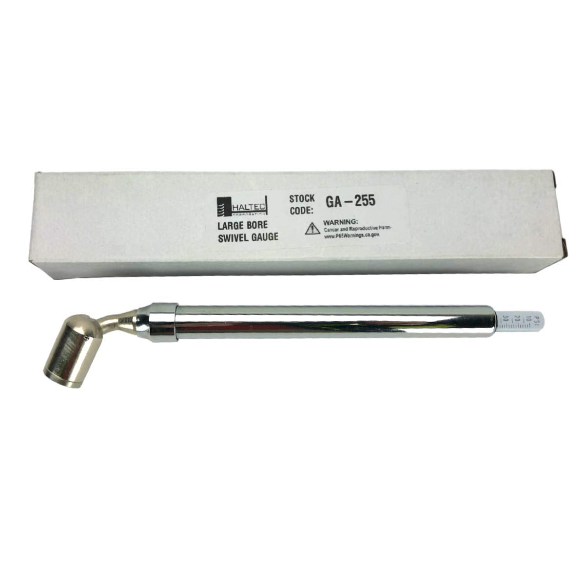 This is a Haltec GA-255 Large Bore Swivel Foot Air Gauge. The foot swivels 360 Degrees for those hard to reach valves. This air gauge features an easy to read nylon slide bar that is calibrated from 10-150 psi in 2 lb units. This is a heavy duty industrial air gauge made with nickle plated brass that is made to take the daily rigors of any maintenance shop. Haltec Corporation has been the leader in the tire valve industry for over 45 years. When underground mines were transitioning from rail wheels to rubber tires, Haltec was there to design and manufacture the tire valve systems required to meet their technical needs. Haltec maintains its leadership position as a major manufacturer of specialized tire valve systems. Many new product innovations were introduced by Haltec, including the Full-Flo and Super Large Bore valve designs. These designs provided the tire industry the unique products required to achieve faster flow rates, decreased downtime, and more efficient tire management. The ever-increasing size of mining and construction tires further challenged Haltec engineering to design and manufacture our wide variety of valve systems to meet these demands.