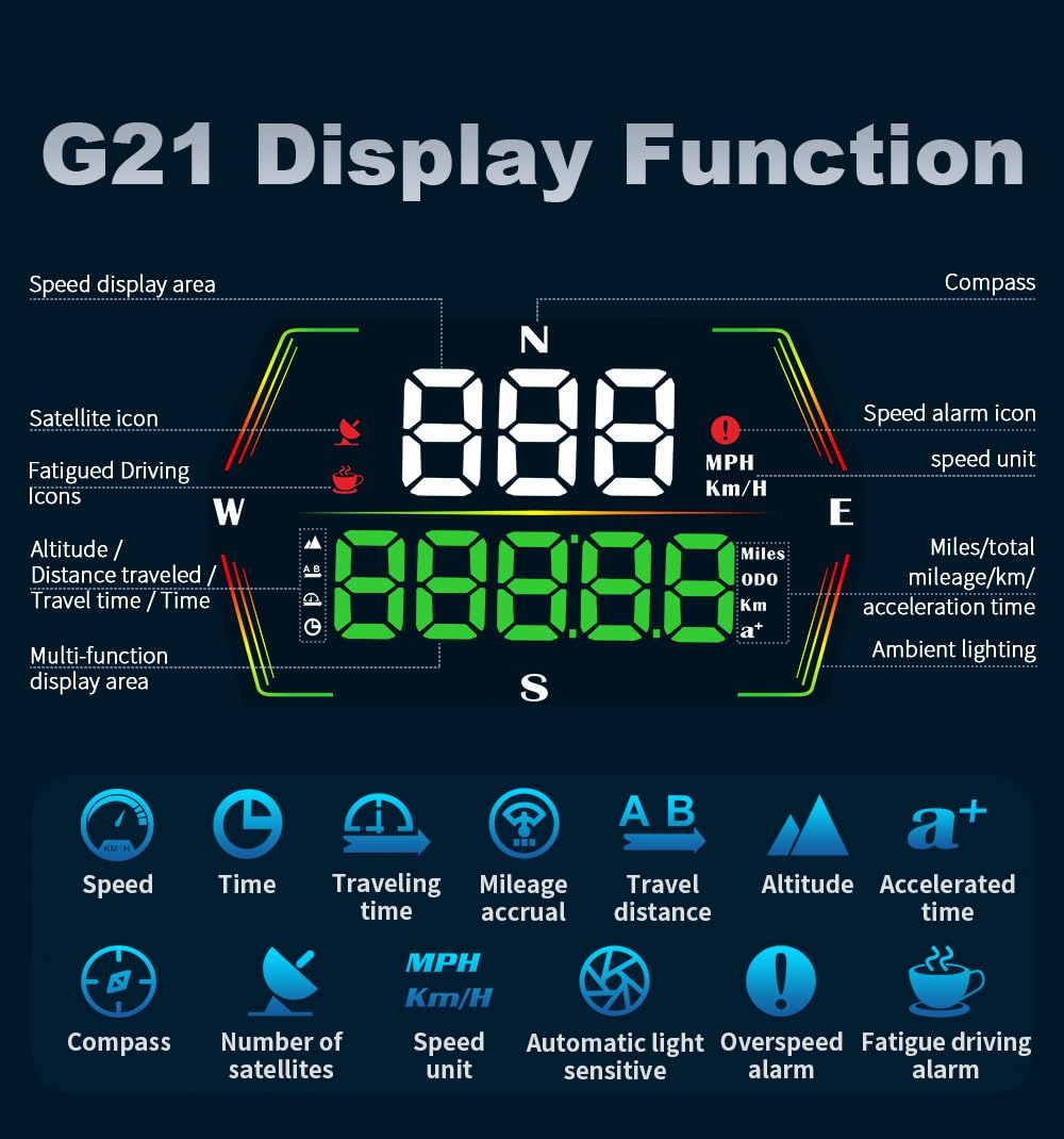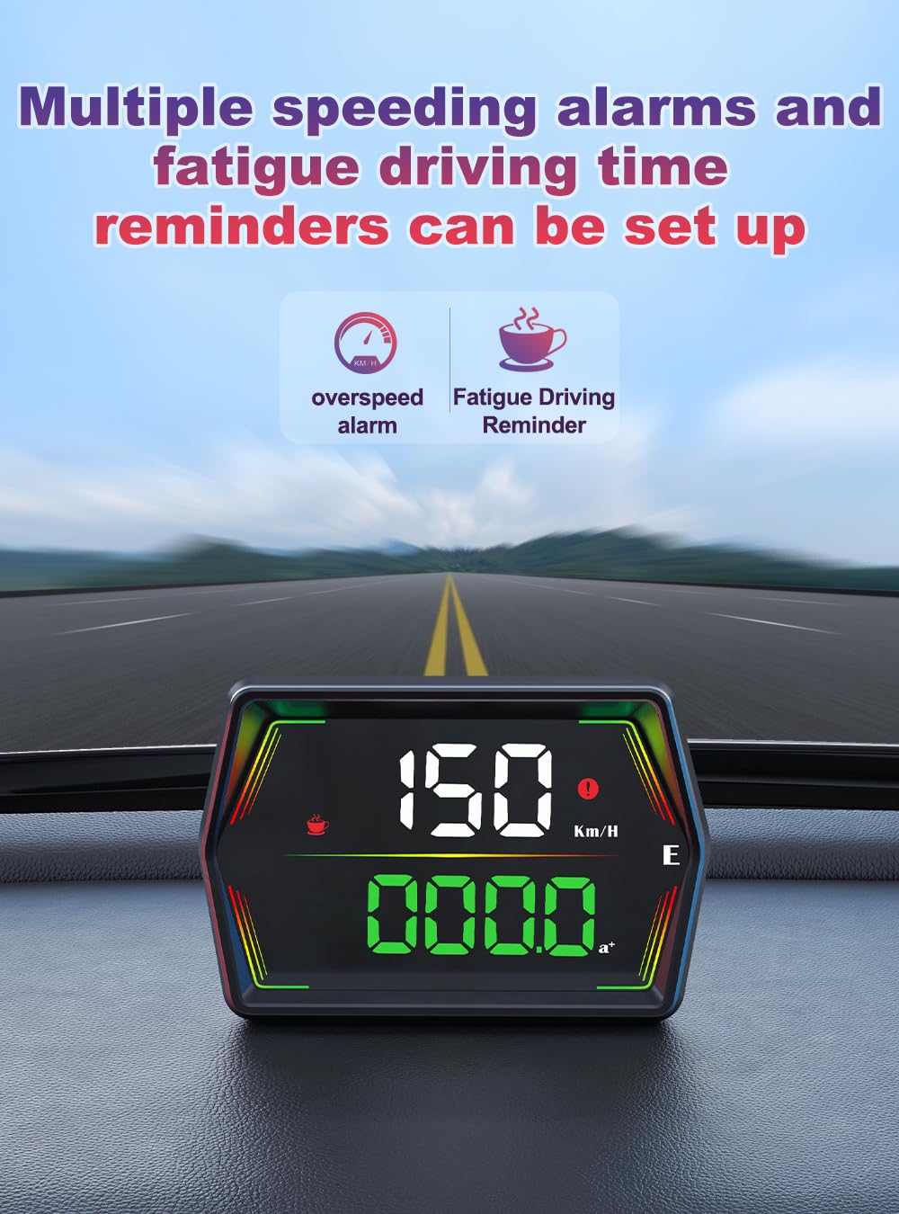 Dual Safety Alerts-This GPS speedometer features two essential alarm functions-Speeding Alert and Fatigue Driving Reminder-to enhance road safety.Speeding Alert: Set a custom speed threshold (default: 120 km/h) to avoid accidents and fines by staying within legal limits.Fatigue Alert: Automatically triggers an alarm after 4 hours of continuous driving, reminding you to take a break for safer journeys.A must-have upgrade for your cars dashboard, keeping you alert and compliant on the road. With Compass Function-This advanced speedometer features a built-in vehicle compass that delivers real-time directional data, ensuring confident navigation in any environment. Whether you're maneuvering through urban streets or venturing off-road, the compass provides essential orientation to complement your journey. With ODO Function-Heads up display for cars with advanced system features comprehensive mileage tracking, including permanent ODO (total distance) recording with auto-save upon engine shutdown, plus a dedicated trip meter for measuring point-to-point journey distances. All data remains securely stored for accurate driving analytics. Universal HUD for Any Vehicle with USB Port - Simply plug into your car's USB port for instant heads-up display functionality. Compatible with all vehicles - for motorcycles cars trucks taxi golf car - car heads up display hud requires no setup or modifications. The auto-start design driving