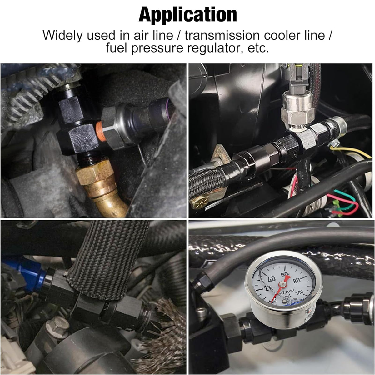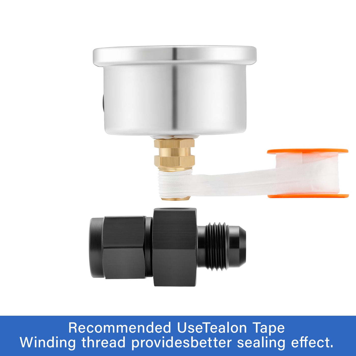 Description This pressure gauge is designed for fuel in automative replacement industry, which is used for measuring the fuel pressure. Widely used in air line, transmission cooler line, fuel system, EFI system and fuel injection system. Dial size: 1-1/2'' Process connection: 1/8''NPT male center back Fuel pressure take off fitting: AN6 Male to 6AN Female, aluminum alloy material, anti-corrosion to ensure long-term use. Case: 304 stainless steel case and crimped ring Window: Polycarbonate Dial plate: aluminum, with pointer stop Pointer: Aluminum, black, DIN style Bourdon tube: Copper alloy Movement: Brass Connection: Brass,two pieces design Oil cap: rubber, black color Filling: Glycerin filled, dampens the effect of vibration and pulsation; lubricates the movement and extends the life of gauge. IP class: IP67 Accuracy: +/-3-2-3%, Pressure range: 0-100psi single scale Working temperature: -4 to 140 deg F/-20 to 60 deg C Ambient temperature: 140 deg F/60 deg C maximum Measureman has 20 years rich experience in the measuring of pressure, temperature, flow, level industries, The ''Measureman'' branded products are the combination of continuous good quality and affordable price. ''Measureman'' products are selected and designed by professional engineers.