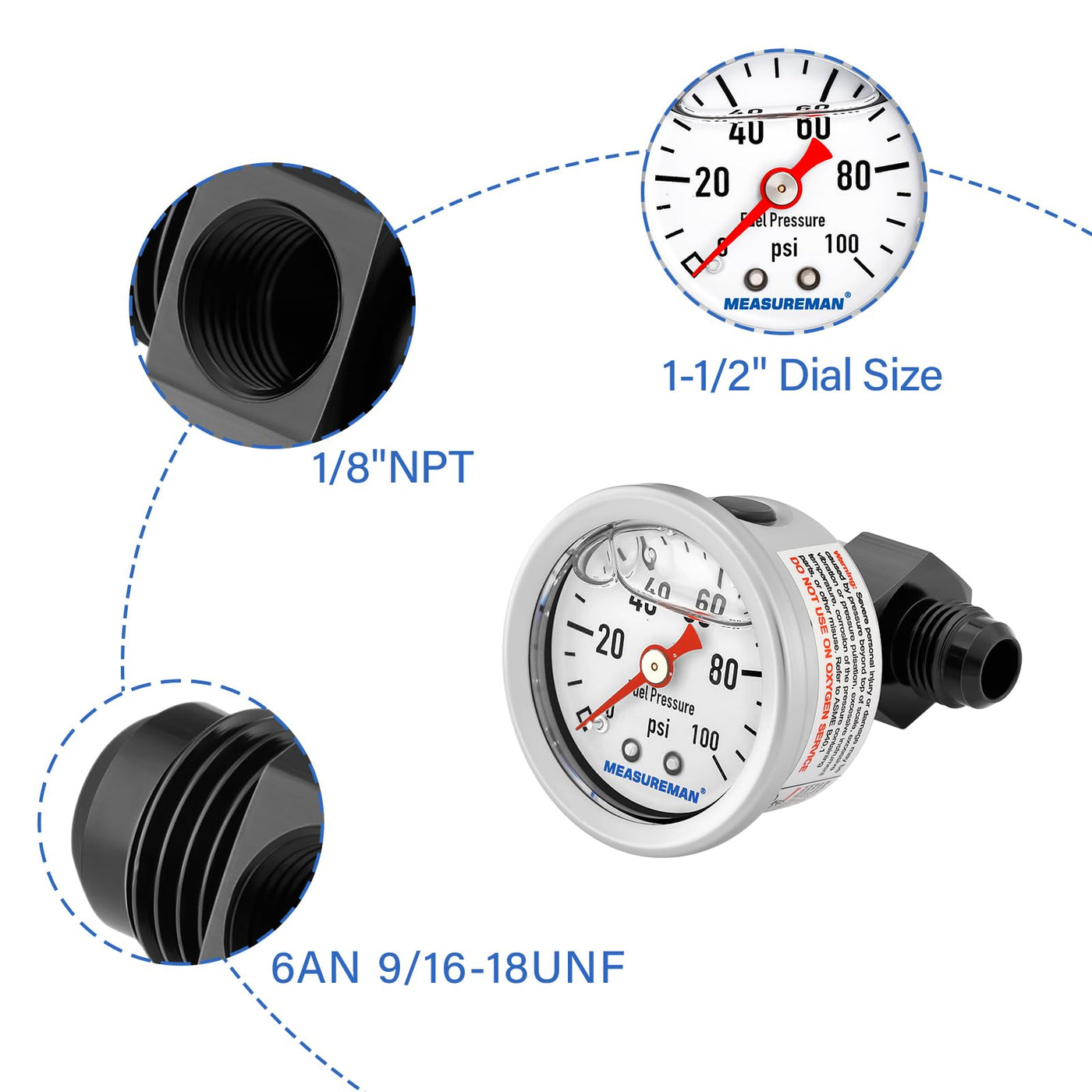 Measureman 0-100Psi Stainless Steel Glycerin Filled Fuel Pressure Gauge, 1-1/2'' Dial Size, With 6An Fuel Pressure Take Off Fitt