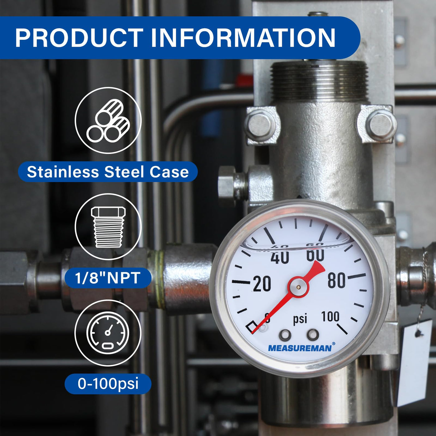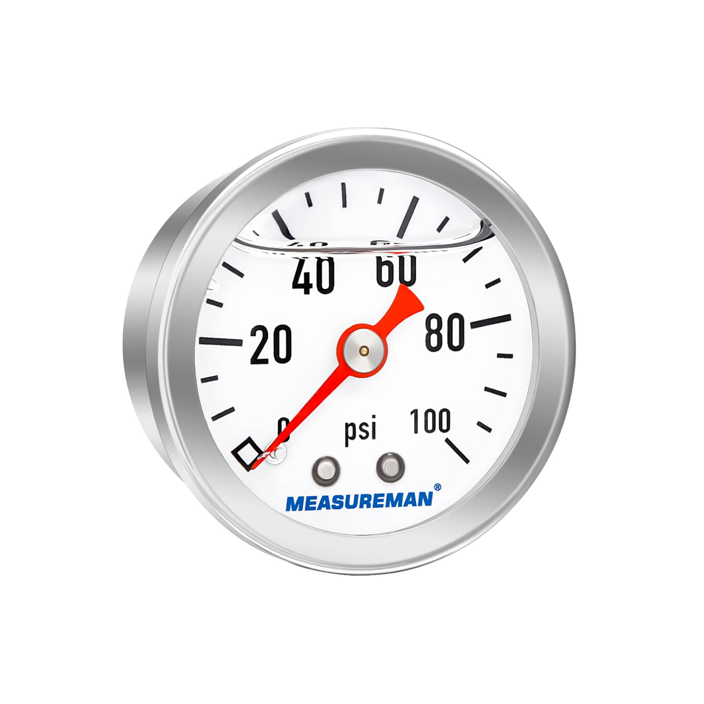 Measureman 1-1/2'' Dial Size, 304 Stainless Steel Case, Liquid Filled Fuel Pressure Gauge, 0-100Psi, 3-2-3%, 1/8'' Npt Center Ba