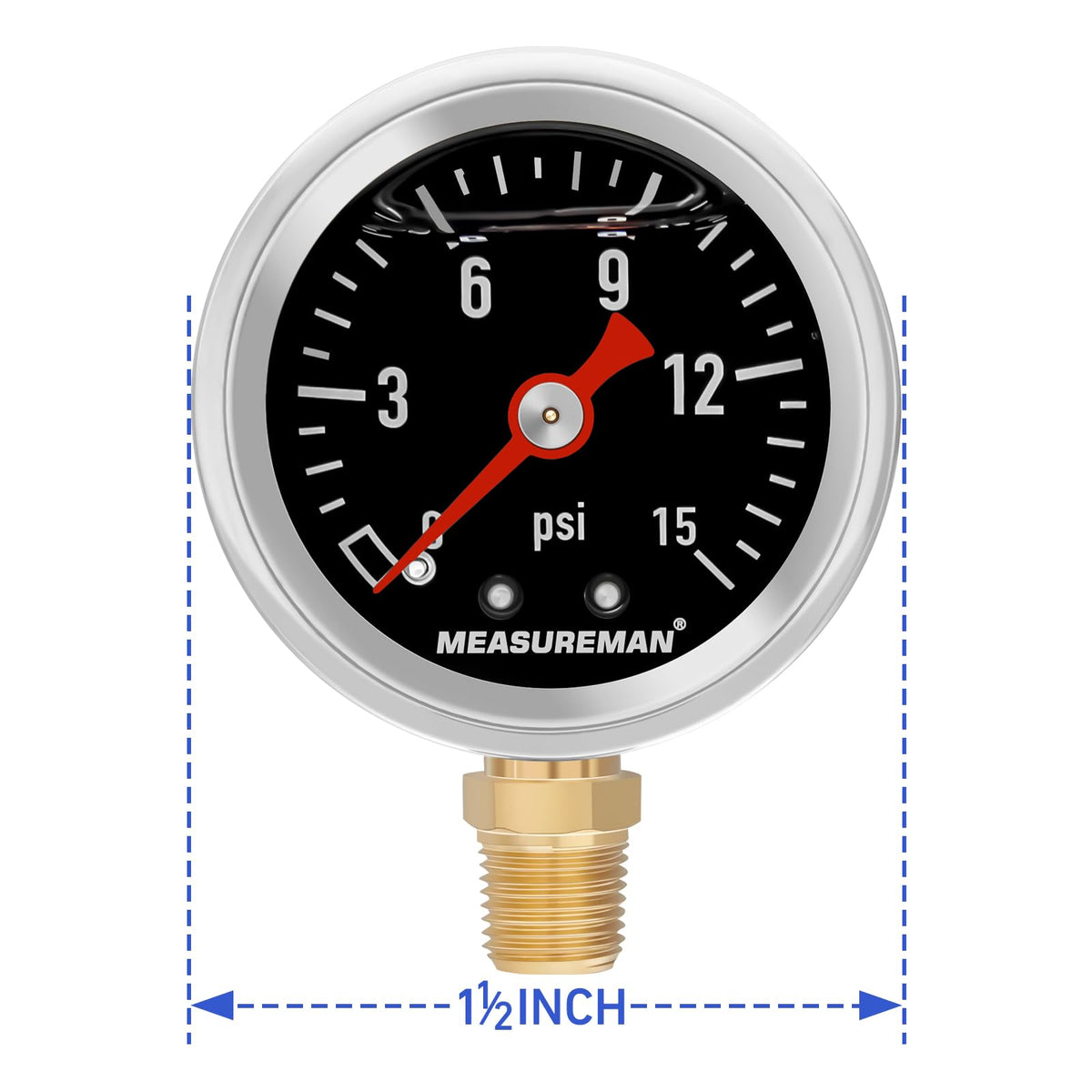 Description This mini pressure gauge is designed for fuel in automative replacement industry, which is used for measuring the fuel pressure. Dial size: 1-1/2'' Process connection: 1/8''NPT male lower Case: 304 stainless steel case and crimped ring Window: Polycarbonate Dial plate: aluminum, with pointer stop Pointer: Aluminum, black, DIN style Bourdon tube: Copper alloy Movement: Brass Connection: Brass,two pieces design Oil cap: rubber, black color Filling: Glycerin filled, dampens the effect of vibration and pulsation; lubricates the movement and extends the life of gauge. IP class: IP67 Accuracy:+/-3-2-3%, Pressure range: 0-15psi single scale Working temperature:-4 to 140 deg F/-20 to 60 deg C Ambient temperature:140 deg F/60 deg C maximum Measureman has 20 years rich experience in the measuring of pressure, temperature, flow, level industries, The ''Measureman'' branded products are the combination of continuous good quality and affordable price. ''Measureman'' products are selected and designed by professional engineers.